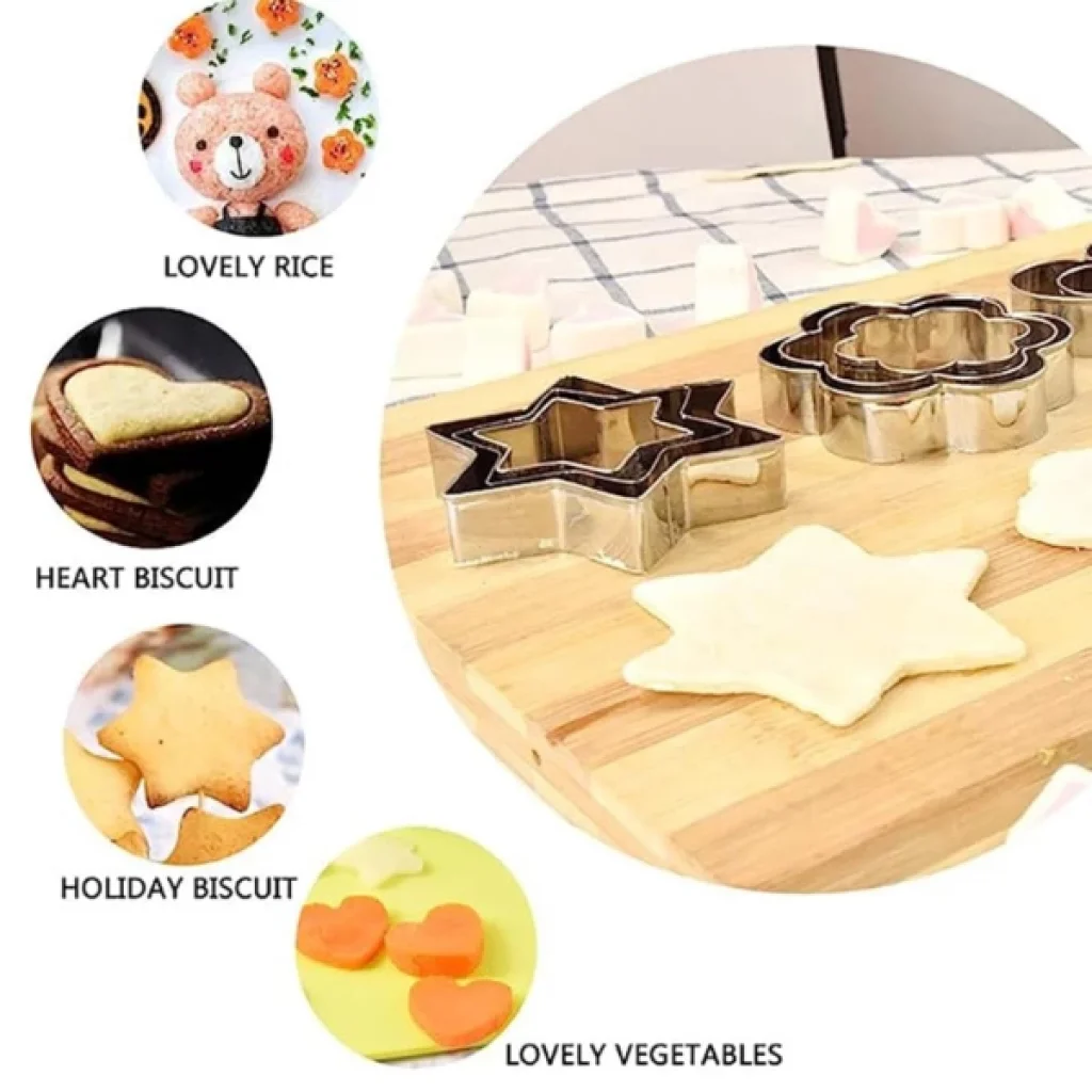 12 ADET PASLANMAZ ÇELİK KURABİYE KALIBI SETİÜrün Özellikleri12 adet paslanmaz çelik kurabiye kalıbı seti, dayanıklı ve hijyenik yapısıyla mutfakta pratik kullanım sağlar. Kalpler, yıldızlar, çiçekler ve daireler gibi 4 farklı şekli bulunan bu set, her şeklin üç farklı boyutuyla toplam 12 parçadan oluşur. Yalnızca kurabiye hamuru için değil, aynı zamanda sebze, meyve, yumurta veya hamur işi sunumlarında da yaratıcı biçimlendirmeler yapmanıza imkân tanır. Paslanmaz çelik yapısı sayesinde uzun ömürlü kullanım sunar ve kolay temizlenir. Pürüzsüz kenarları sayesinde güvenli bir kullanım deneyimi sağlar. Evde, kafelerde veya pastanelerde dekoratif sunumlar yapmak isteyenler için ideal bir yardımcıdır.Paket İçeriği1 adet 12’li paslanmaz çelik kurabiye kalıbı seti