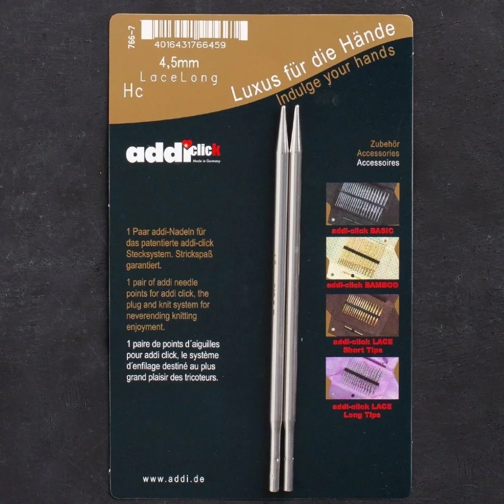 Addi Click Sistem uyumlu dantel örgüsüne özel şiş. Farklı numaralarda şişleri değiştirerek kullanabilmenize olanak sağlayan Addi Click sisteme uyumlu şişlerdir.