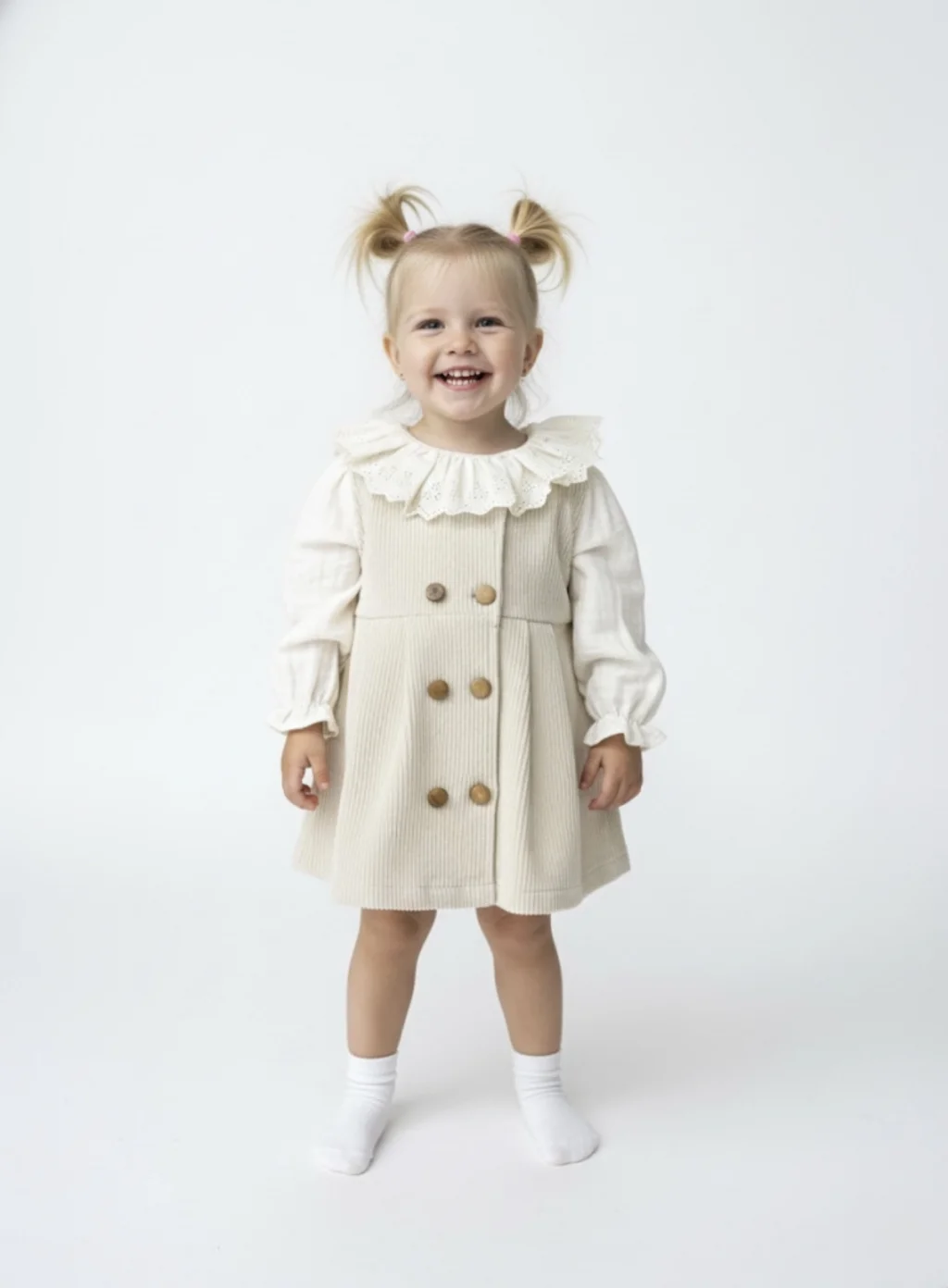 Bej Fitilli Kadife Düğmeli Jile Elbise
