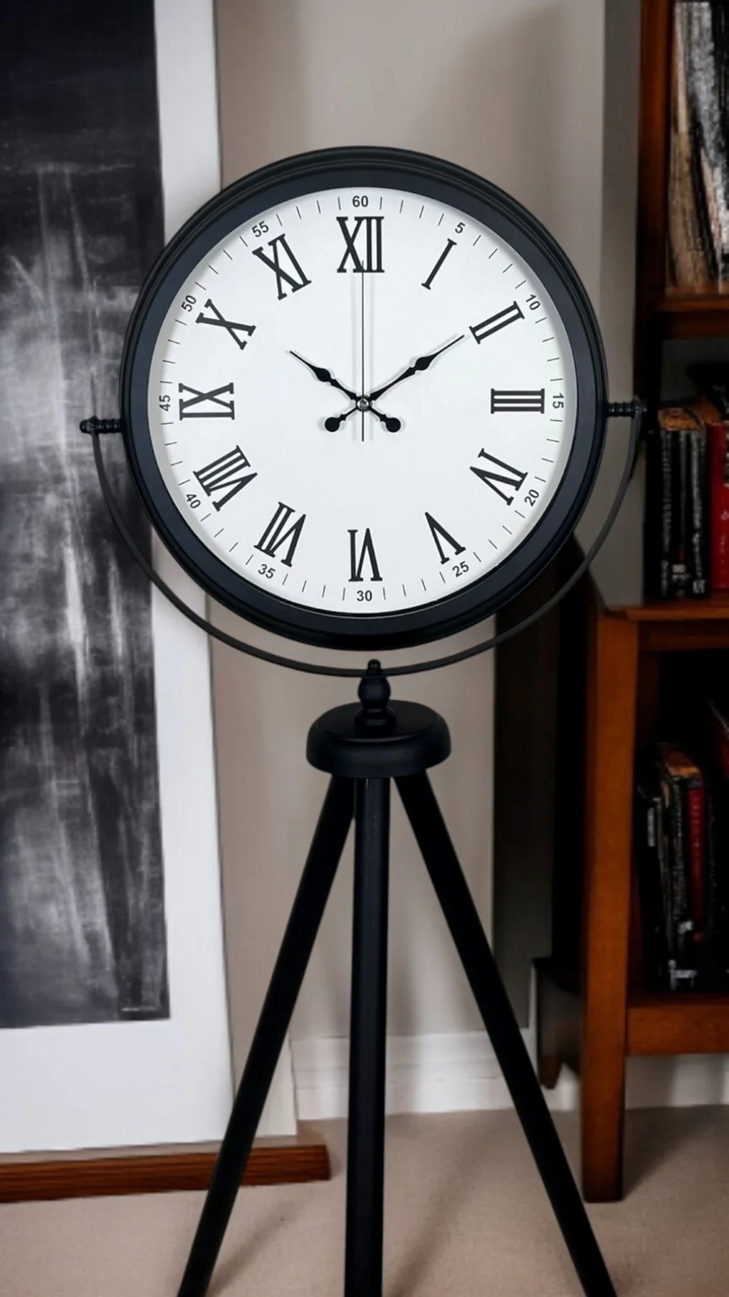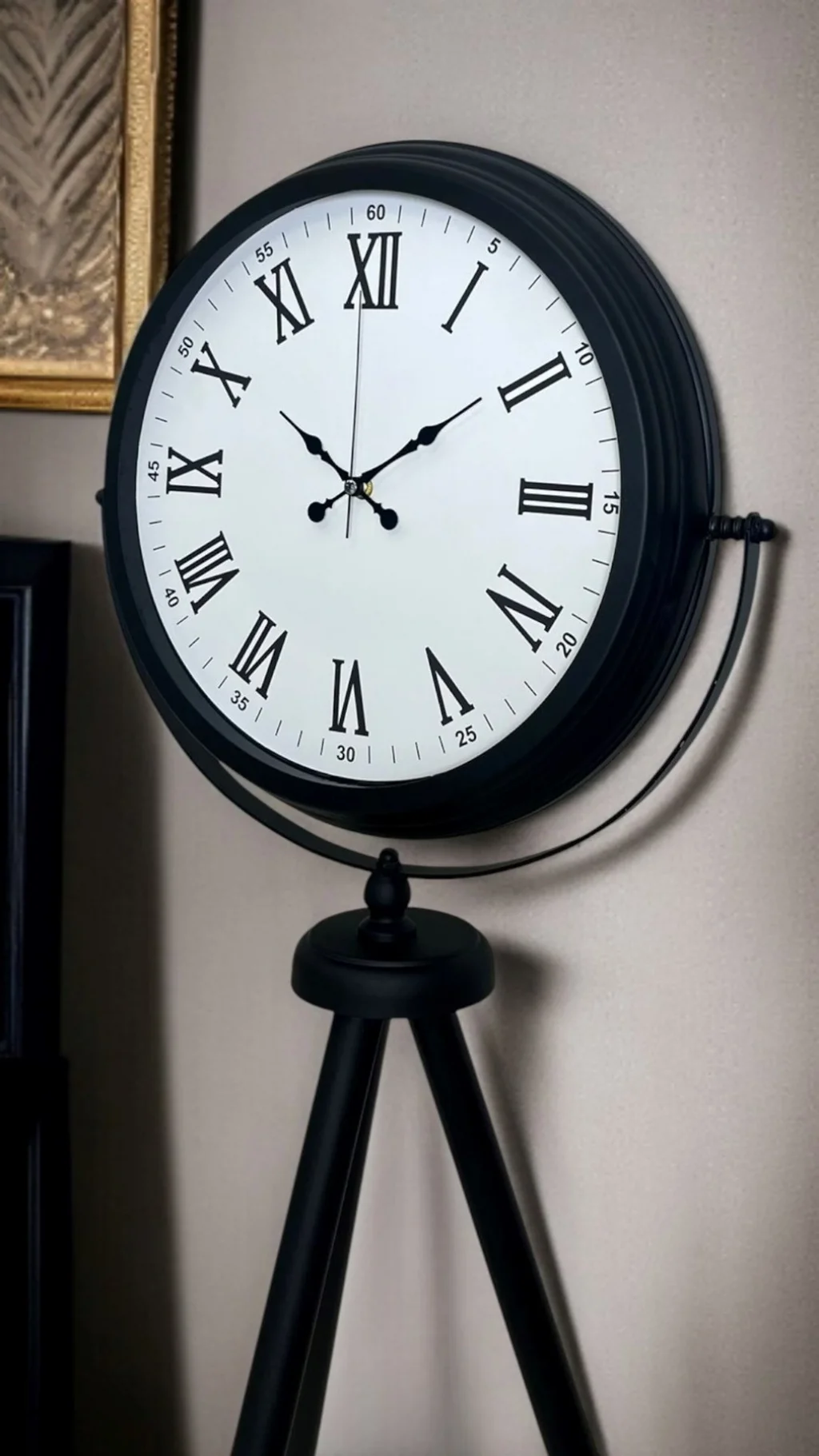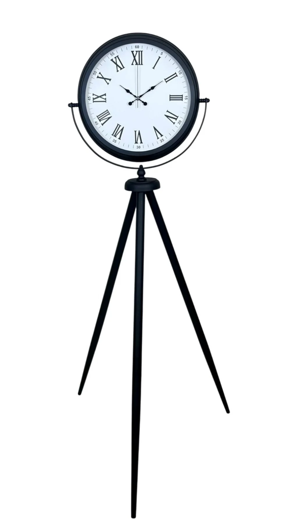 Klasik kadran şıklığını modern tripod tasarımla buluşturan Siyah Tripod Ayaklı Dekoratif Salon Saati, 150 x 45 cm ölçüsüyle salon, ofis ve geniş yaşam alanlarında etkileyici bir duruş sergiler. Siyah metal tripod ayak yapısı, mekâna modern ve güçlü bir karakter kazandırırken; beyaz kadran üzerindeki Roma rakamları saate zamansız bir zarafet katar. Bu özel tasarım, sadece zamanı göstermekle kalmaz; aynı zamanda bulunduğu ortamda “vitrinlik” bir dekor objesi etkisi oluşturur.