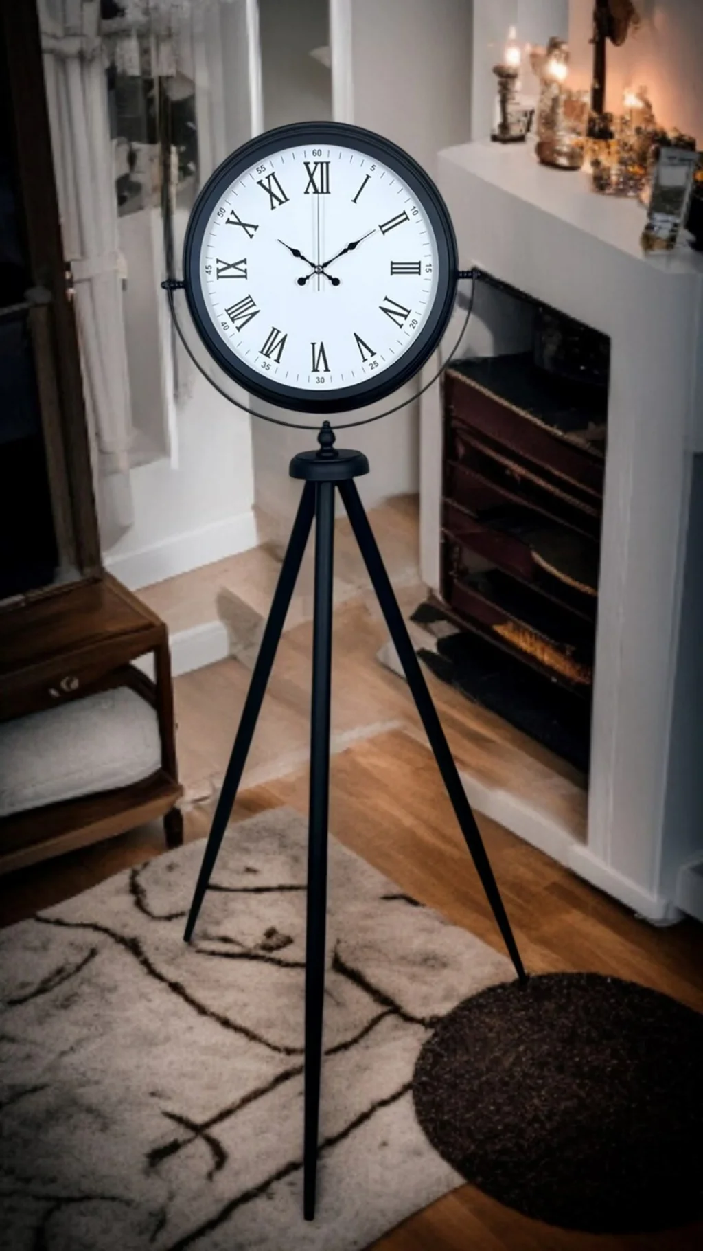 Tripod ayak formu sayesinde zeminde dengeli durur ve bulunduğu ortamı daha şık ve düzenli gösterir. Minimal çizgilerle klasik kadranı bir araya getiren bu model, “zamansız tasarım” arayanlar için ideal bir seçimdir.