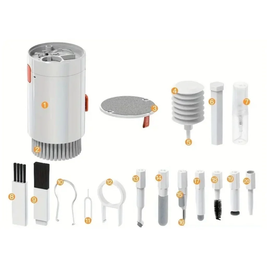 BUFFER® 20 Parça Çok Fonksiyonlu Bilgisayar Temizleme Seti, teknolojik cihazların her köşesini kapsamlı bir şekilde temizleyebilmeniz için 20 farklı parça sunan, çok yönlü bir temizlik kitidir. Detaylı ve titiz bir temizlik deneyimi sunan bu set, özellikle klavye, cep telefonu, kablosuz kulaklık gibi günlük hayatta sıkça kullanılan ve kirlenmeye müsait cihazların hijyenini sağlamak için geliştirilmiştir. İşte setin içeriğindeki her bir parçanın özellikleri ve fonksiyonları:
