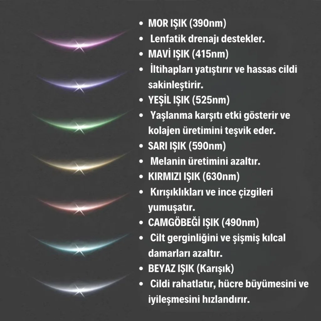 ⚪ Beyaz Işık (Mix): Cilt hücrelerini yeniler ve onarım sürecini hızlandırır.