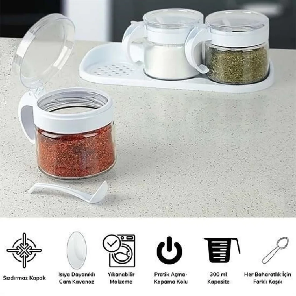 BUFFER® Beyaz 3lü Standlı Kapaklı Kaşıklı Cam Hava Sızdırmaz Baharatlık Takımı KC-386