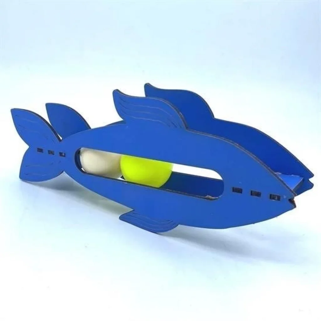Bu ahşap balık oyuncağının içinde yuvarlanan iki topun sesi kedileri meraklandırır ve dikkatlerini toplar