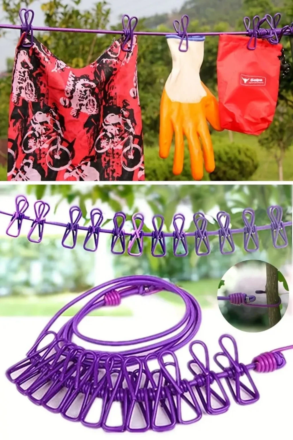 BUFFER® Taşınabilir Seyahat Çamaşır İpi 12 Klipsli Lastikli Çamaşır Mandalları