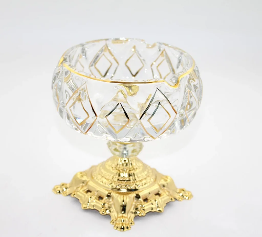 CAM KÜLLÜK MODEL 5Ürün ÖzellikleriCam Küllük Model 5, altın detaylı lüks tasarımıyla klasik ve zarif bir görünüme sahiptir. Kristal cam yapısı sayesinde hem şık hem de dayanıklıdır. Altın kaplama metal ayakları ile estetik bir duruş sergileyerek bulunduğu ortama değer katar. Geniş iç haznesi sayesinde külleri rahatça muhafaza eder. Dekoratif tasarımıyla ev, ofis, restoran ve otel gibi mekanlar için uygundur. Kolay temizlenebilir yapısıyla uzun ömürlü ve hijyenik kullanım sunar.Paket İçeriği1 Adet Cam Küllük Model 5