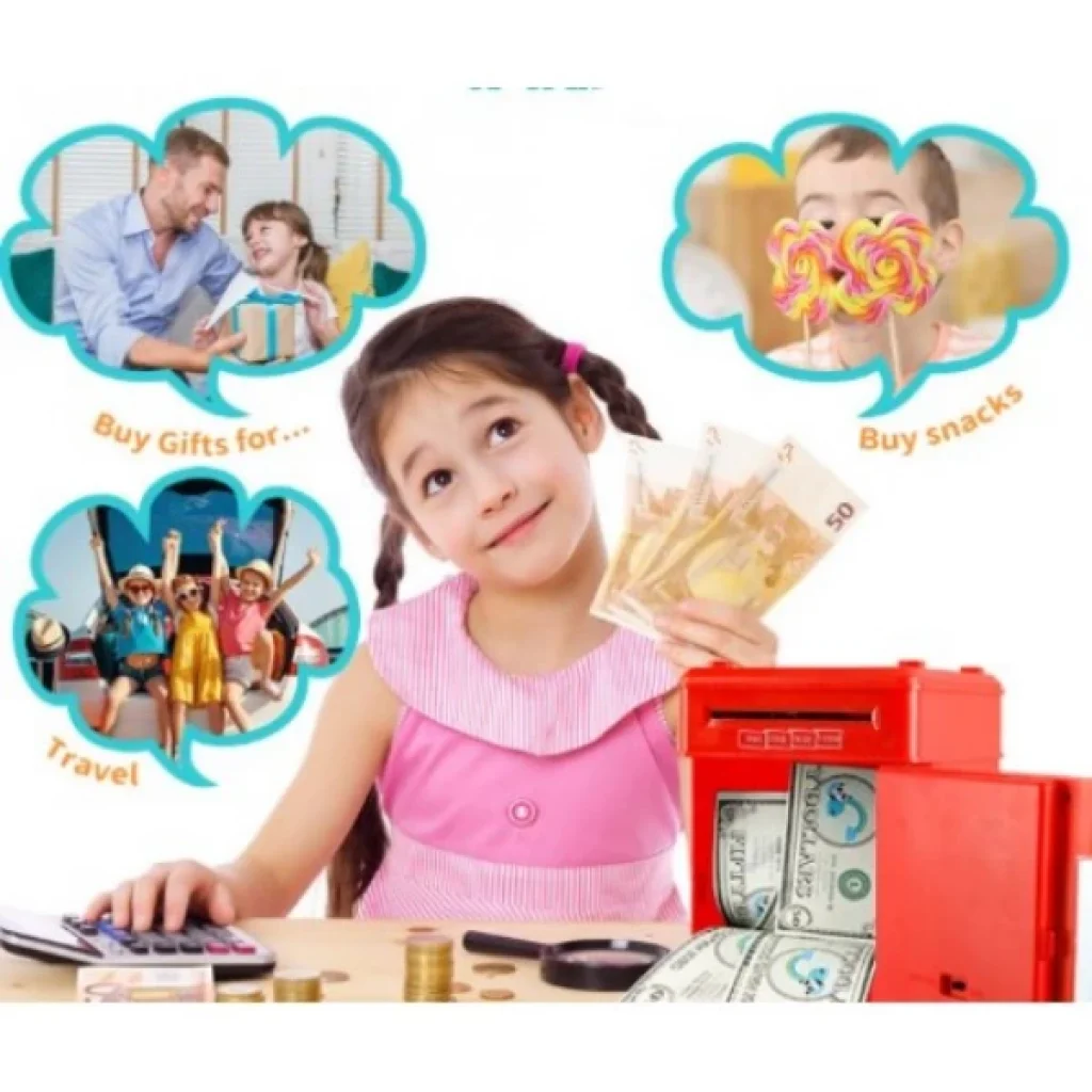 ELEKTRONİK ŞİFRELİ KASA OTOMATİK ATM KUMBARAÜrün ÖzellikleriElektronik şifreli kasa otomatik ATM kumbara, çocukların tasarruf bilincini eğlenceli bir şekilde kazanmalarına yardımcı olur. Bankamatik tarzı tasarımıyla kağıt paraları otomatik olarak içine çeker, madeni paralar için özel bir yuvası bulunur. Şifreli güvenlik sistemi sayesinde yalnızca doğru şifre girildiğinde açılır (varsayılan şifre 0000’dır). 19,2 x 13,8 x 13,2 cm ölçülerindeki bu kumbara, 3 adet AA pil ile çalışır (piller pakete dahil değildir). Üzerindeki ışıklı tuş takımı ve sesli geri bildirim özelliği, çocuklar için hem eğlenceli hem öğretici bir deneyim sunar. Kaliteli plastik gövdesi dayanıklıdır ve uzun ömürlü kullanım sağlar. Renk seçimi yapılamaz, görseldeki pembe veya mavi renklerden karışık olarak gönderilir.Paket İçeriği1 adet elektronik şifreli kasa ATM kumbara