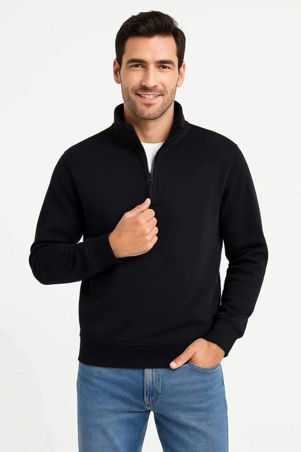 Erkek Dik Yaka Sweatshirt Dik Yaka Yarım Fermuarlı 3 İplik Şardonlu Pamuk Kumaş - Siyah