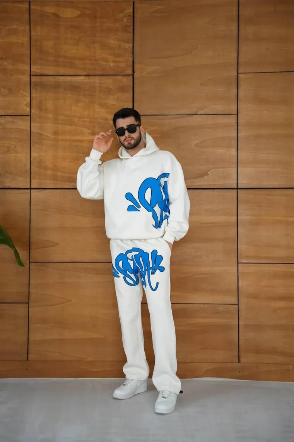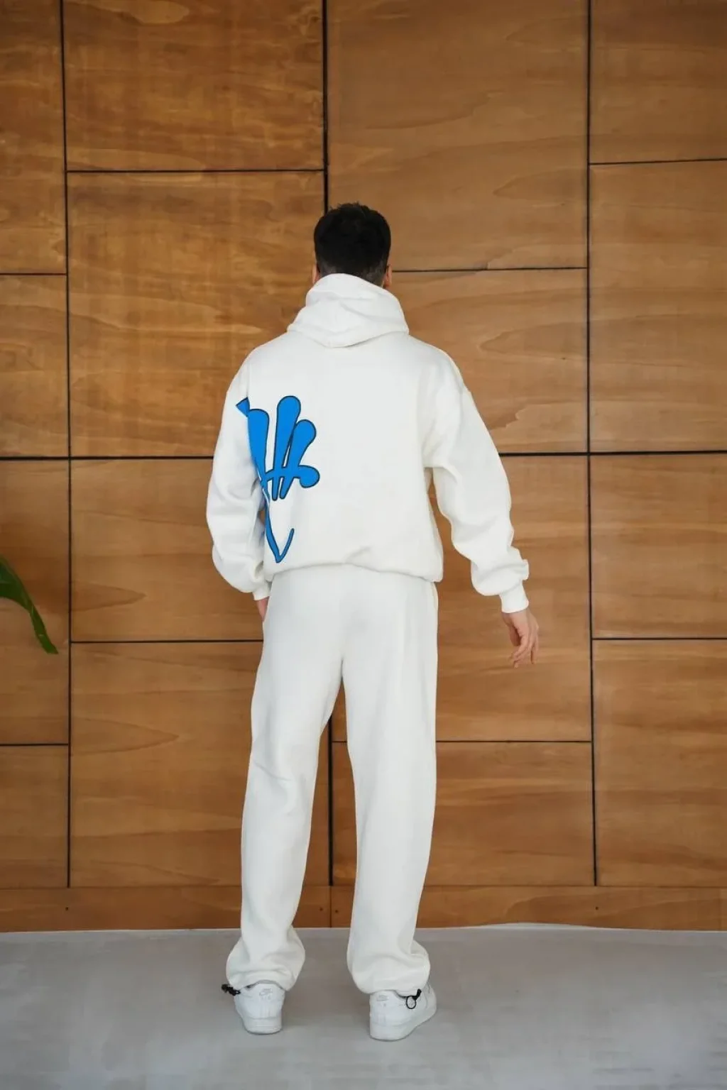 Erkek Kapüşonlu Eşofman Takım Graffiti Baskılı Oversize Rahat Kalıp, Kanguru Cepli, Streetwear Tarzında Premium Ürün 3 iplik Pamuklu - Beyaz