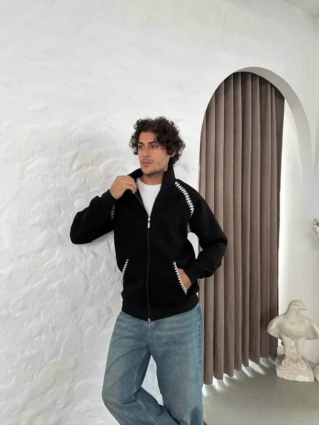 Erkek Oversize Dik Yaka Fermuarlı Sweatshirt - Zincir Nakışli Kanguru Cepli - Siyah