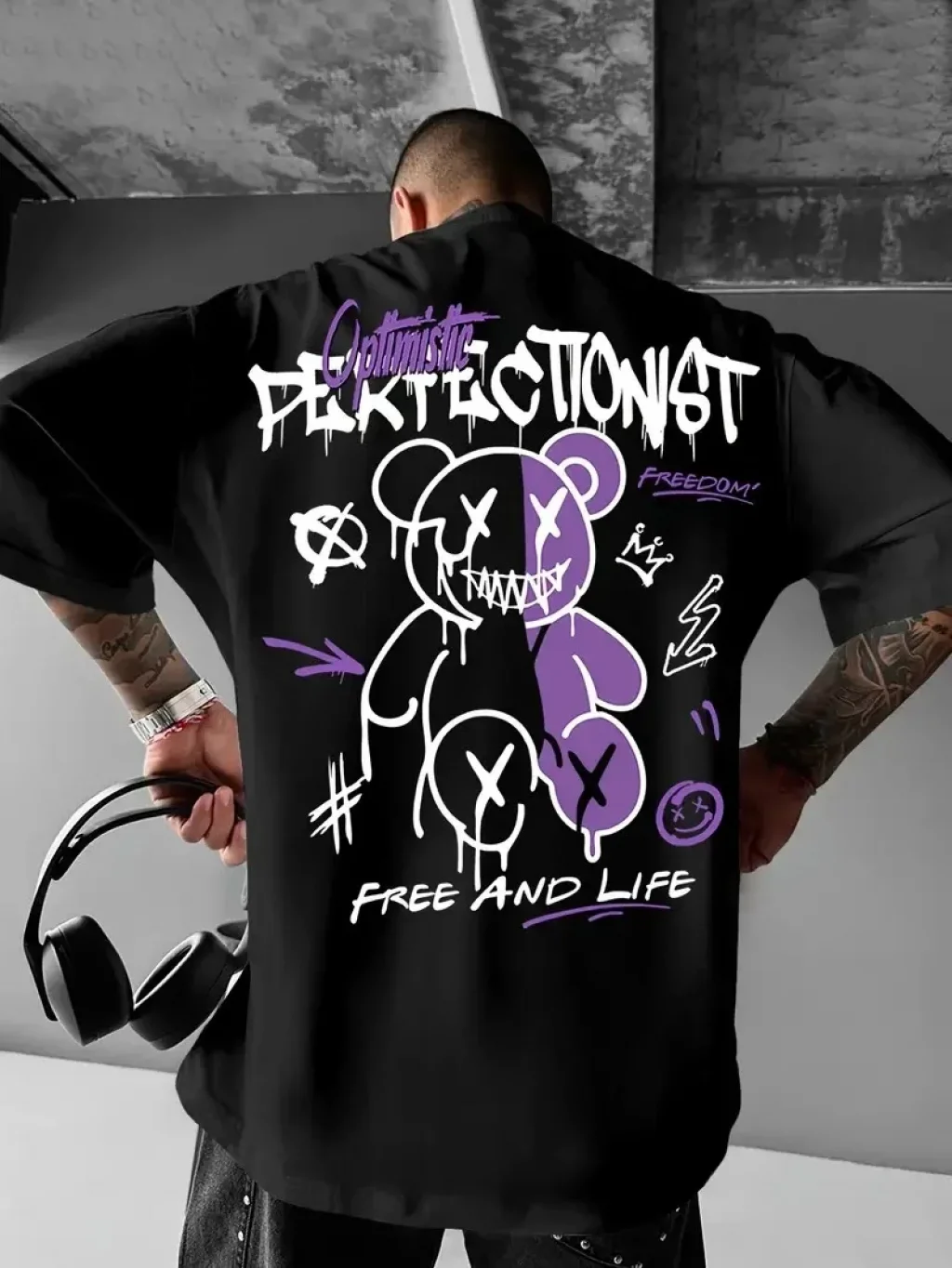 Erkek OversizeGrafik Tişört "CAMPBRASTCOOPERATION" Kalın Yazı Bisiklet Yaka, Kısa Kol, Kalın Mor ve Siyah Desenli Yazlık Sokak Kıyafeti - Siyah