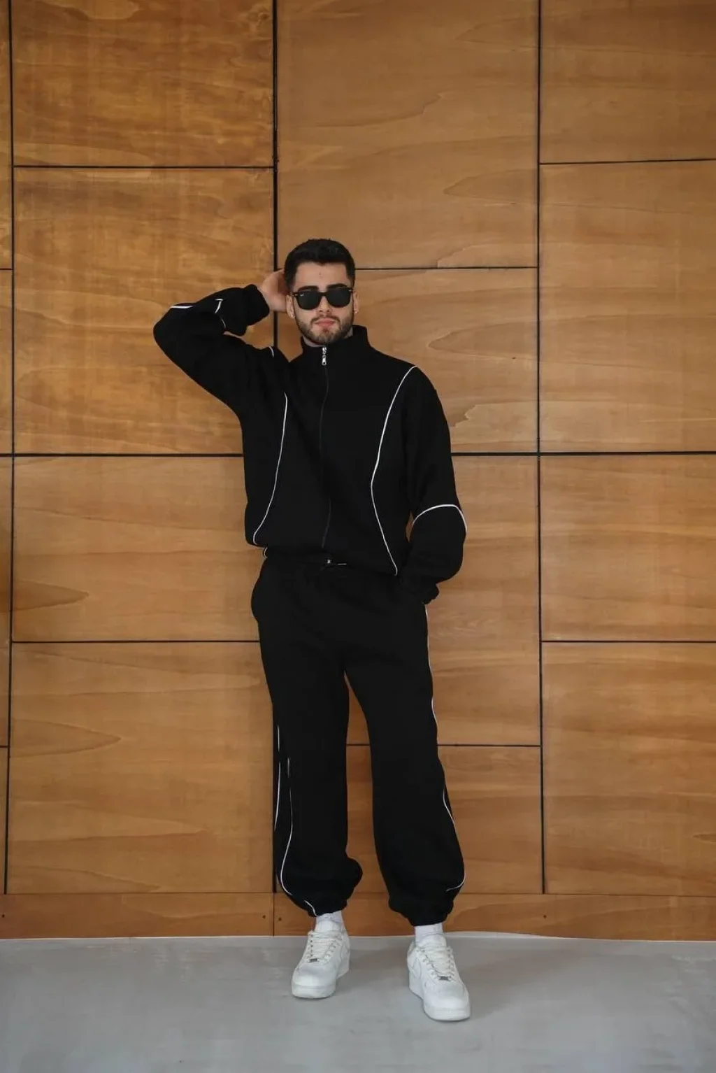 Erkek Premium Parçalı Eşofman Takım - Dik Yaka Fermuarlı Biyeli Sweatshirt Lastik Paça Alt, Oversize 3 iplik Şardonlu - Siyah