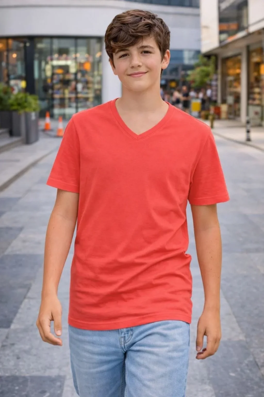 Genç Erkek Çocuk V Yaka Tişört Yazlık Model Günlük Basic Body - Nar Çiçeği