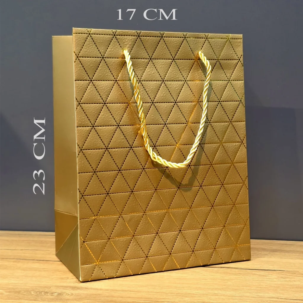 GOLD GEOMETRİK DESENLİ ORTA BOY KARTON HEDİYE ÇANTASI Ürün ÖzellikleriHediyenizin etkisini ilk saniyeden itibaren artırın! Gold Geometrik Desenli Orta Boy Karton Hediye Çantası, lüks altın sarısı tonları ve modern geometrik dokusuyla her türlü sunuma prestij katar. 23x17 cm boyutlarındaki ideal yapısı; parfümler, orta boy dekoratif objeler, tekstil aksesuarları veya özel hediye setleri için mükemmel bir koruma ve estetik sağlar. Yüksek kaliteli ve dayanıklı kalın karton malzemeden üretilen gövdesi, içindeki hediyeyi güvenle taşırken şık formunu asla bozmaz. Parlak yüzey kaplaması sayesinde ışığı yansıtan bu çanta; düğün, nişan, kurumsal etkinlikler veya özel kutlamalar için asil bir tercih oluşturur. Dayanıklı ip sapları ve şık tasarımıyla bu çanta, sadece bir ambalaj değil, hediyenizin kalitesini vurgulayan tamamlayıcı bir unsurdur.Ürün Teknik ÖzellikleriÖzellikAçıklamaBoyutlar23 cm (Yükseklik) x 17 cm (Genişlik)MalzemeBirinci Sınıf Kaliteli ve Kalın KartonTasarımLüks Gold (Altın) Geometrik Kabartma DesenliBoyut TipiOrta Boy (Medium)Taşıma SapıUyumlu Tonlarda Güçlendirilmiş İp SapKullanım AlanıÖzel Günler, Kurumsal Sunumlar, Lüks PaketlemePaket İçeriği1 Adet Gold Geometrik Desenli Orta Boy Karton Hediye Çantası (23x17 cm).