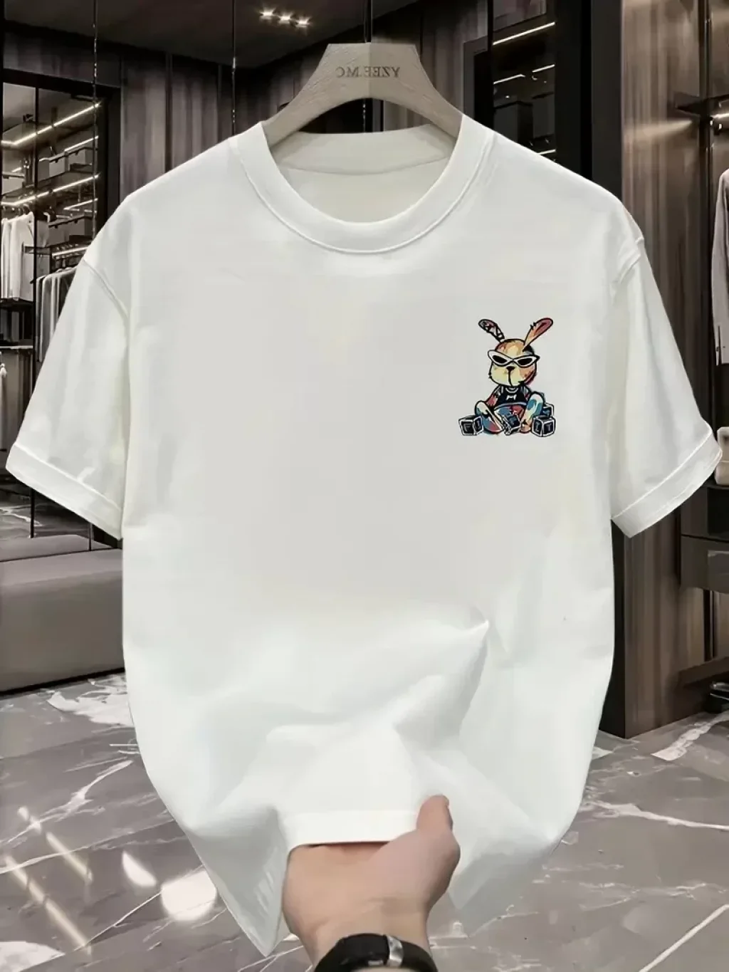 Güneş Gözlüğü Grafikli Karikatür Tavşan Oversize Kısa Kollu Tişört Çift Tişört, İlkbahar Ve Yaz - Beyaz