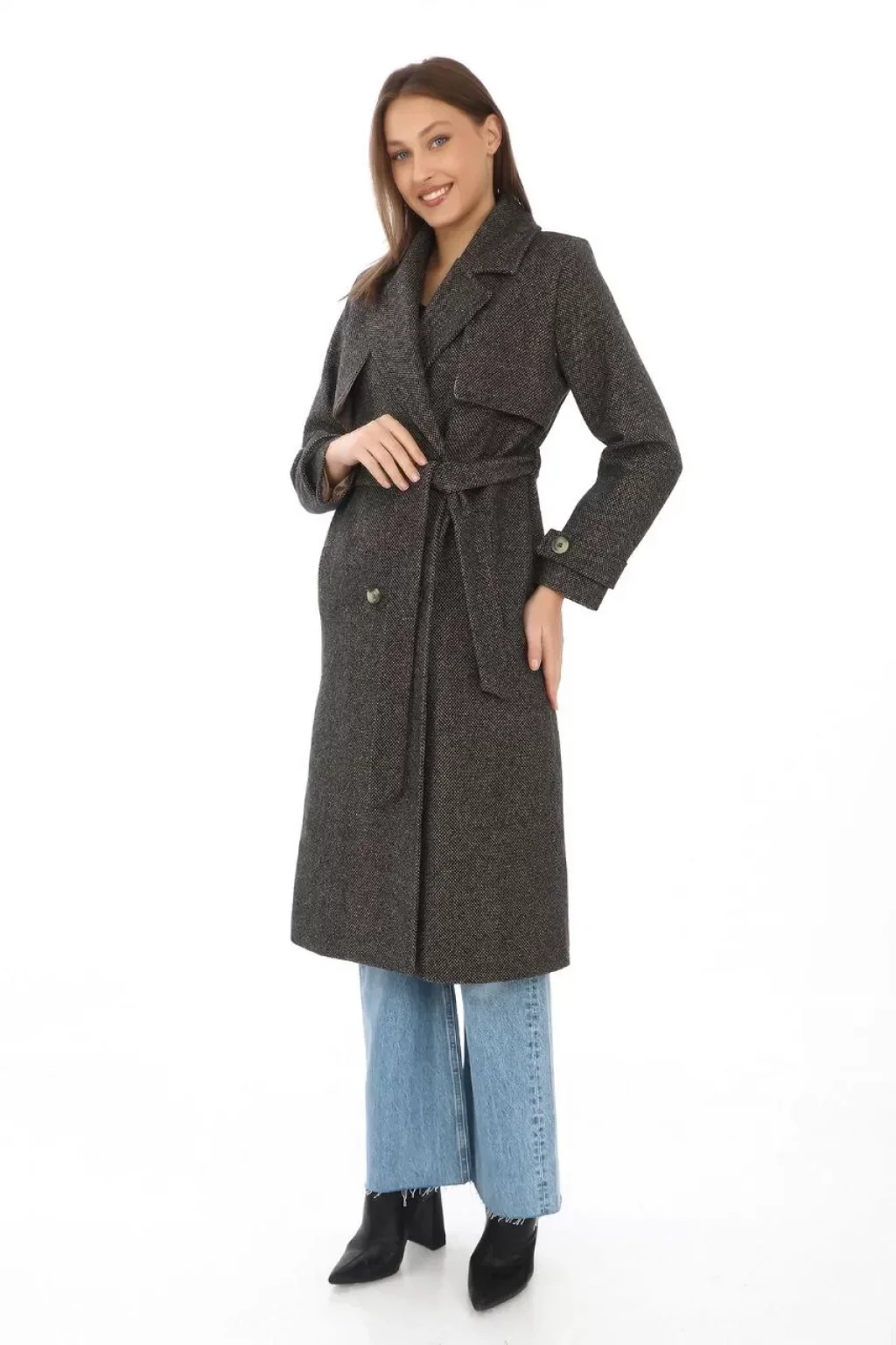 Kadın Balık Sırtı Kaşmir Uzun Kaşe Kaban - Kahverengi
