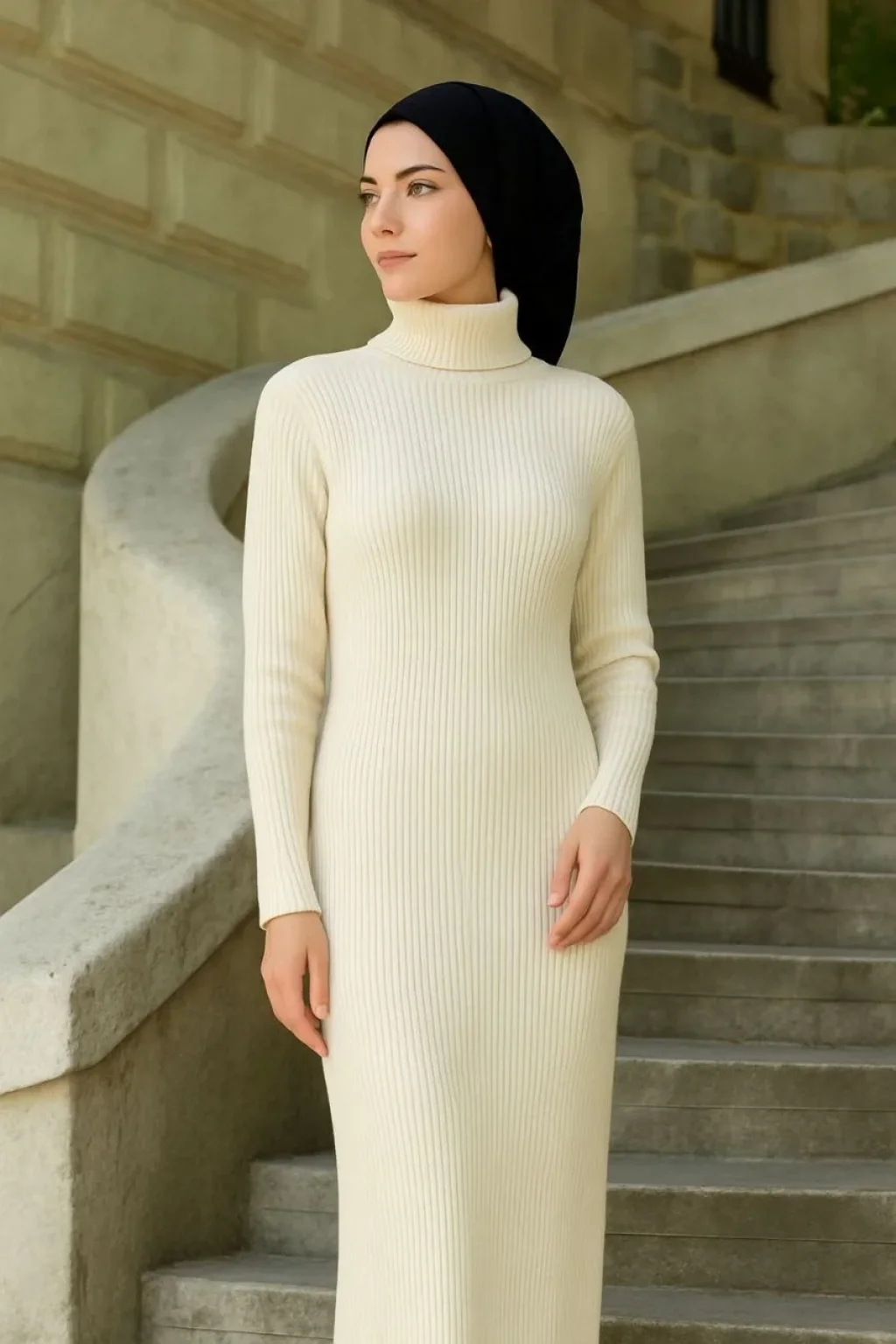 Kadın Boğazlı Uzun Fitilli Tesettüre Uygun Triko Dokuma Elbise - Beyaz