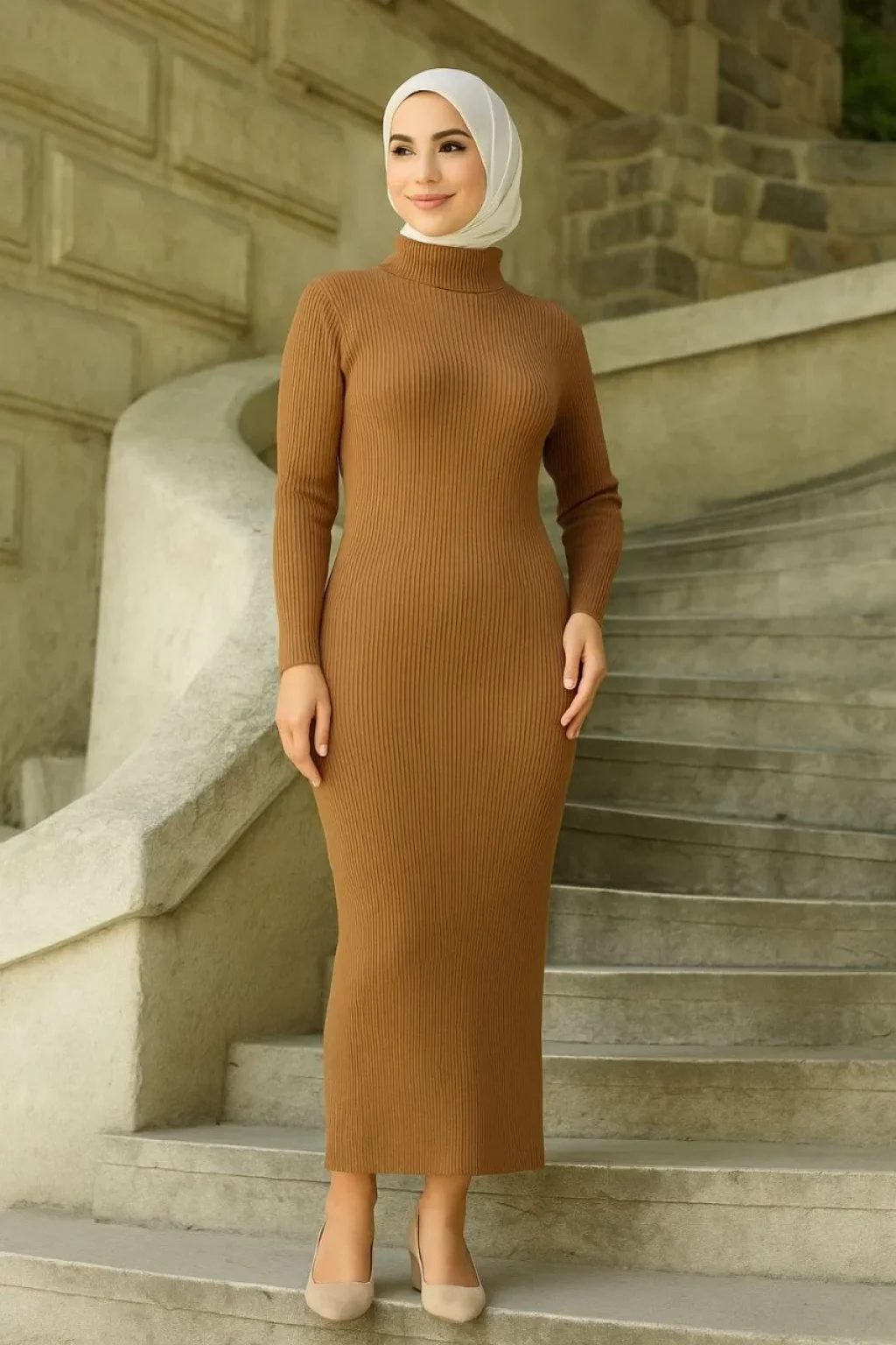 Kadın Boğazlı Uzun Fitilli Tesettüre Uygun Triko Dokuma Elbise - Kahverengi