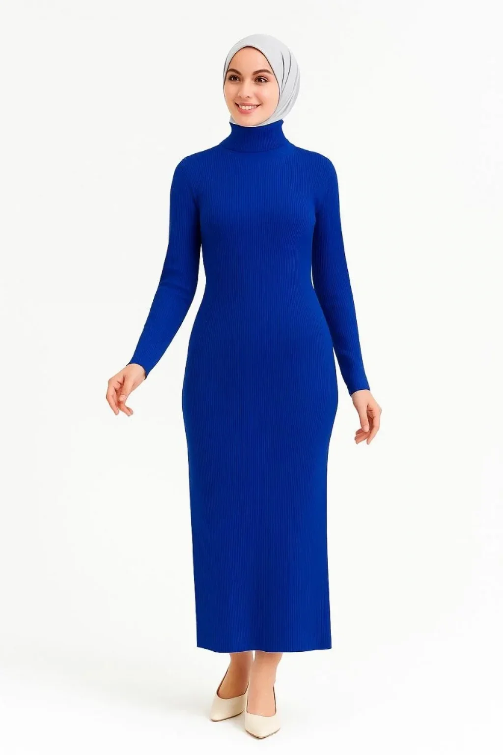 Kadın Boğazlı Uzun Fitilli Tesettüre Uygun Triko Dokuma Elbise - Saks Mavisi