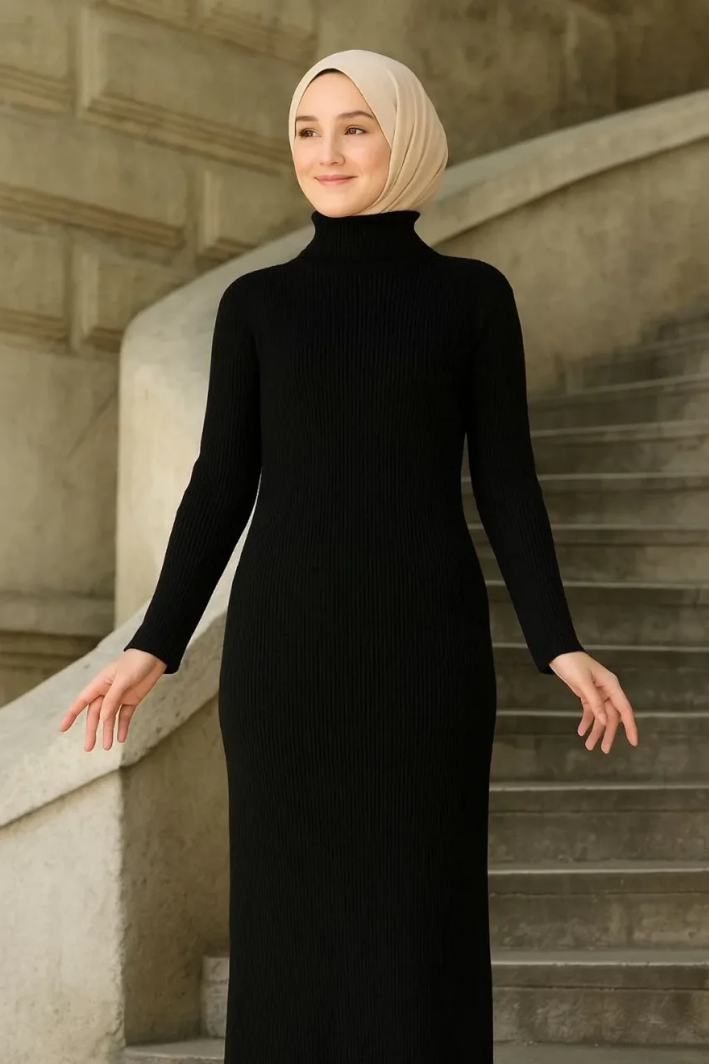 Kadın Boğazlı Uzun Fitilli Tesettüre Uygun Triko Dokuma Elbise - Siyah