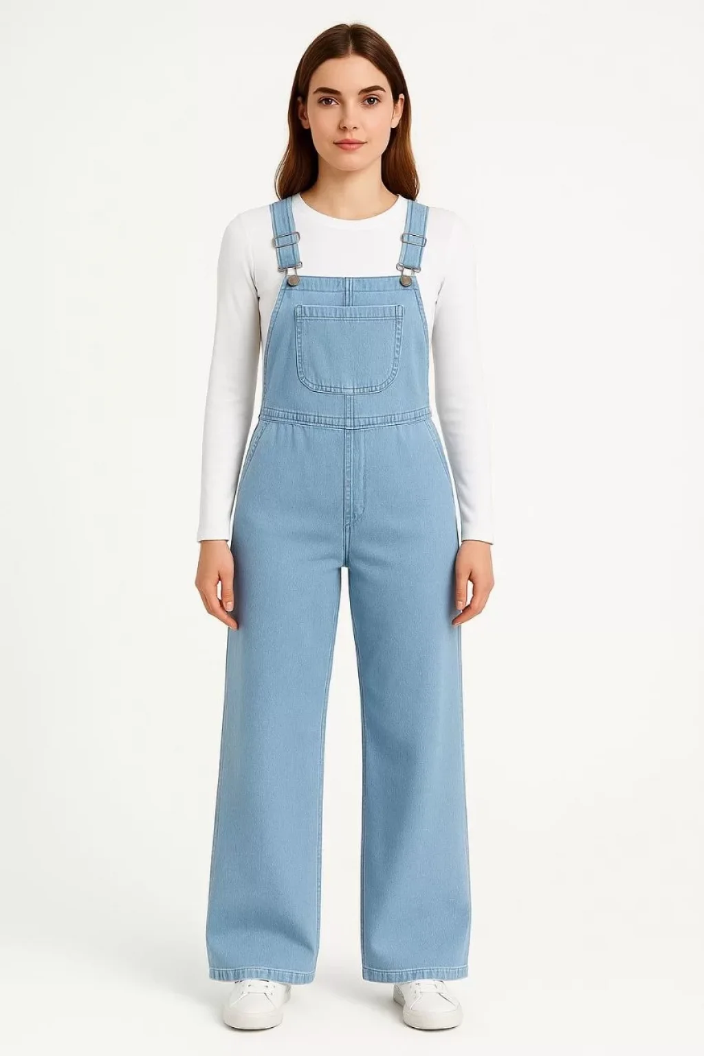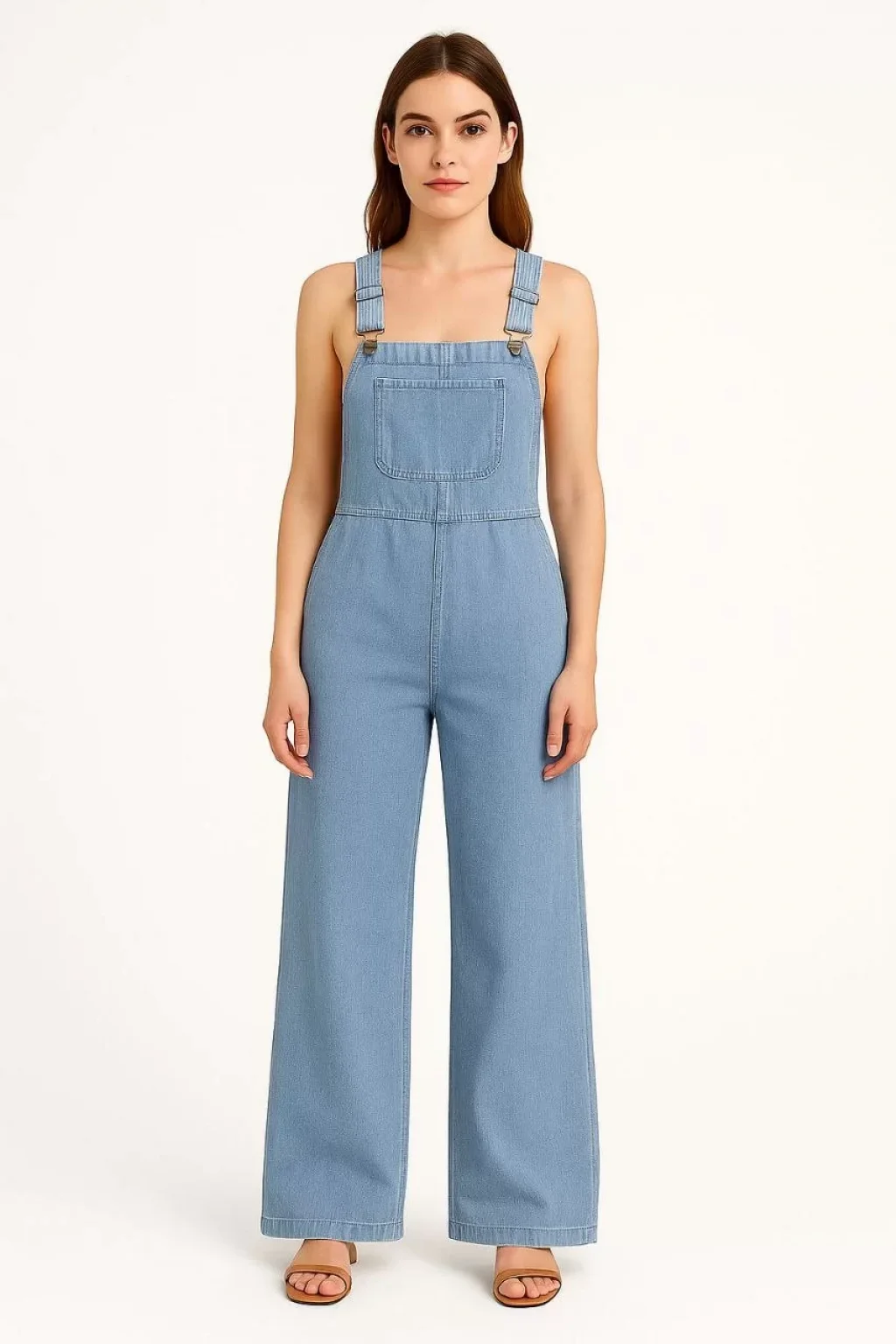 Sezon | 4 mevsimKadın Chambray Açık Mavi Denim Görünümlü Geniş Paça Salopet Tulum |