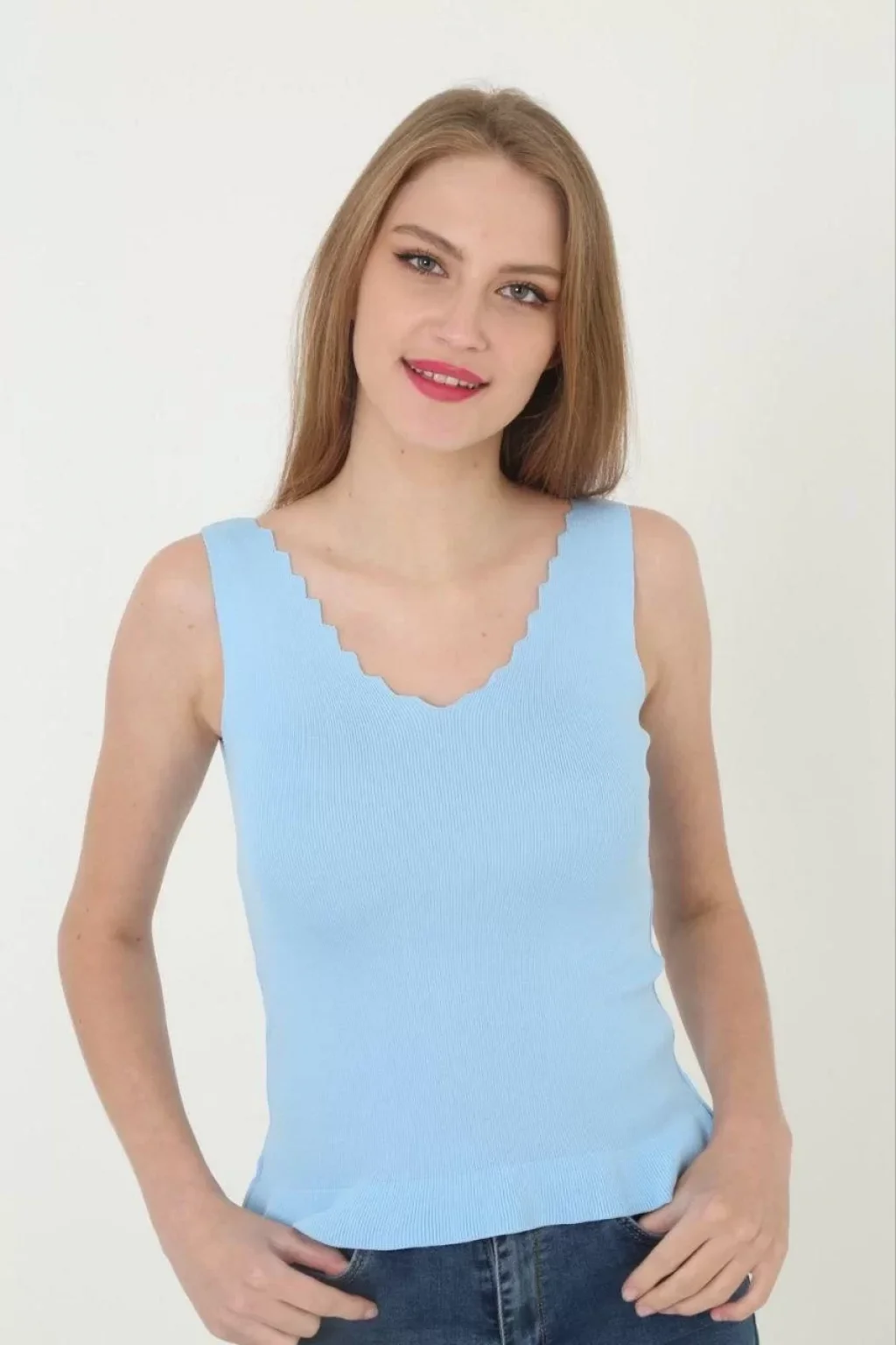 Kadın V Yaka Fırfır Detay Crop - Mavi
