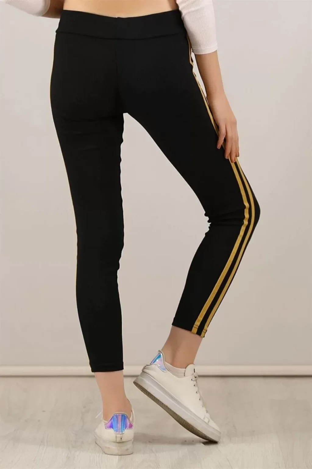 Kadın Yanı Sarı Şeritli Tayt - Siyah