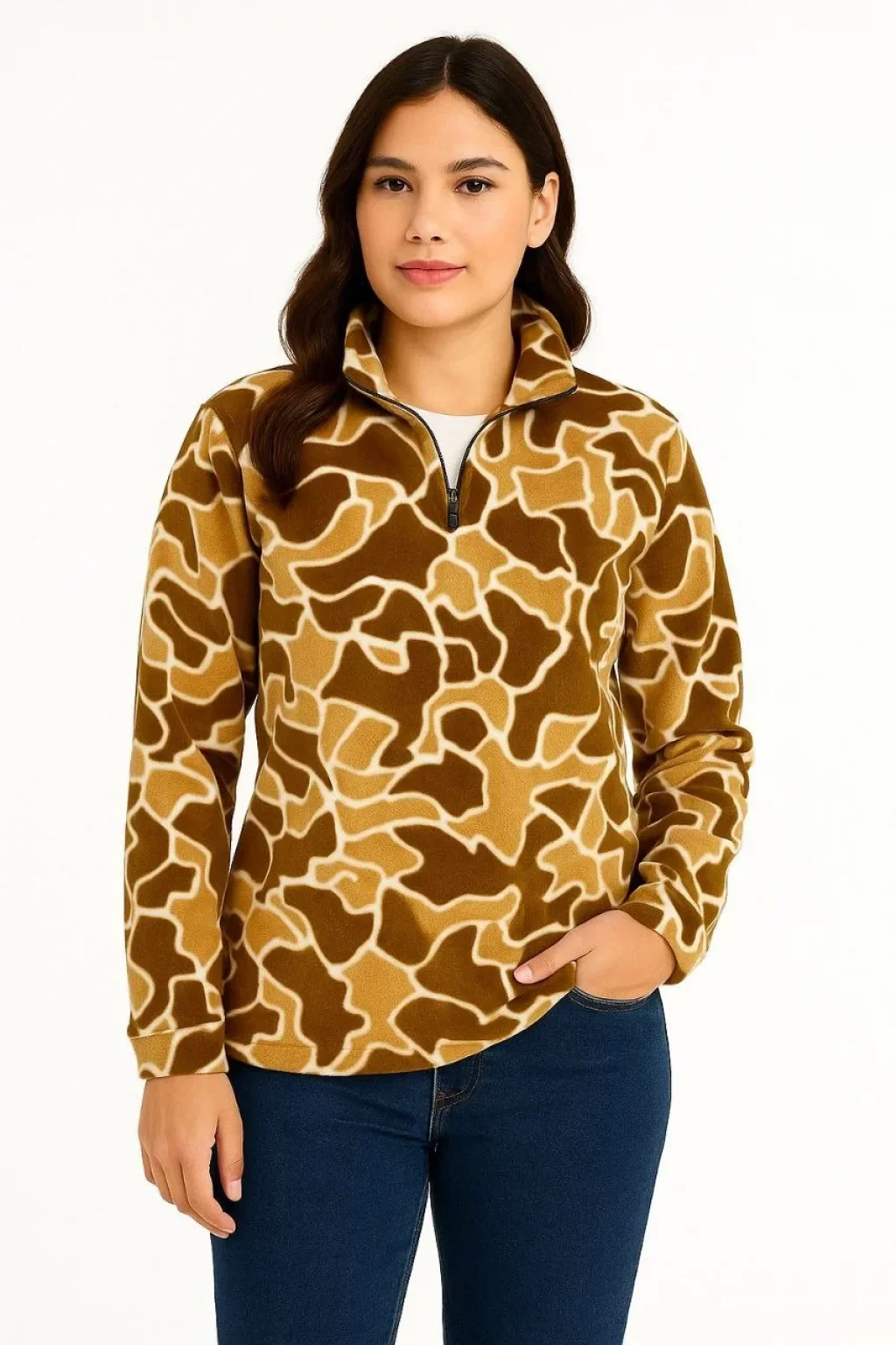 KADIN Yarım Fermuarlı Desenli Polar Sweat Yakalı, Uzun Kollu, Oversize Rahat Kalıp - Kahverengi