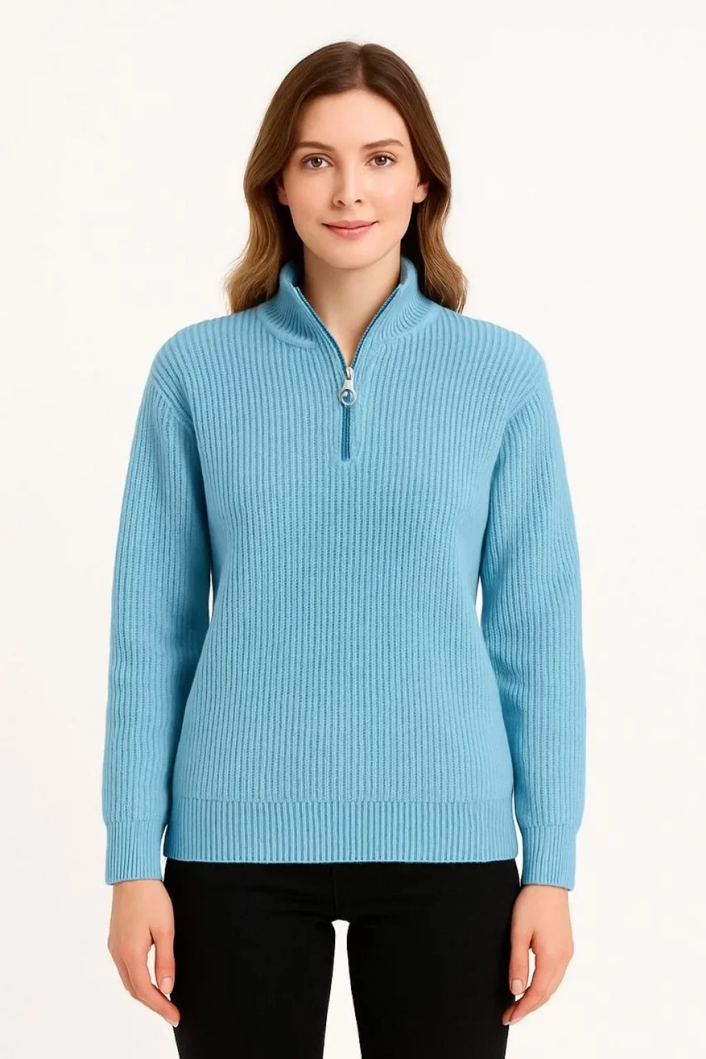 KADIN Yarım Fermuarlı Triko Kazak – Selanik Örgü, Dik Yaka, Pamuklu Dokuma, Oversize Uzun Kollu Kışlık Model - Bebe Mavisi