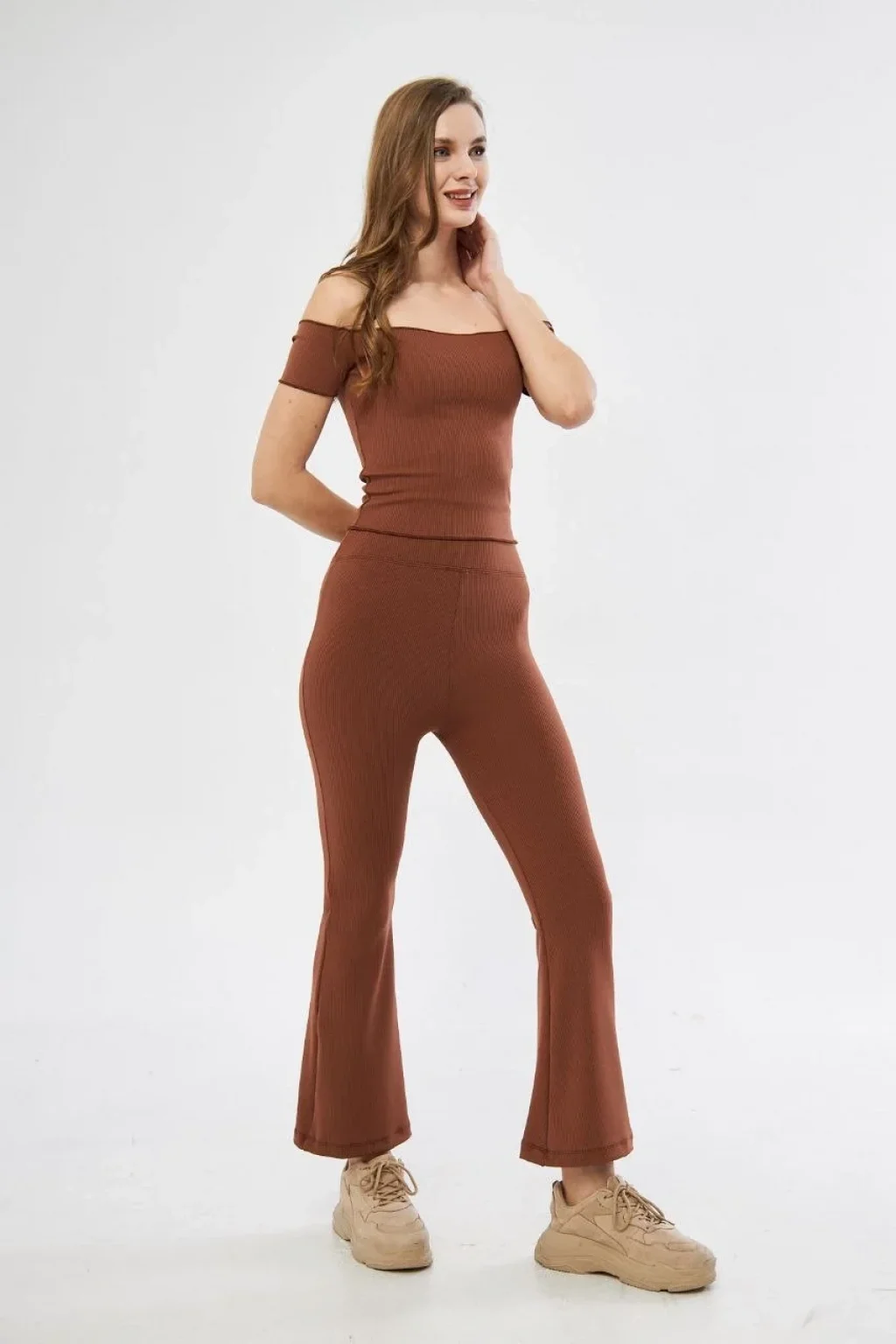 Kadın Yüksel Bel Fitilli İspanyol Paça Tayt - Kahve