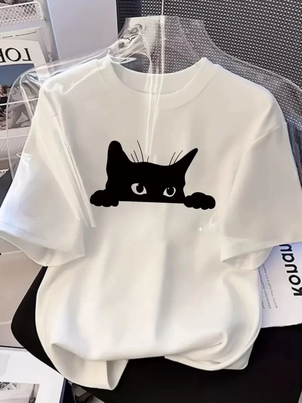 Kadınlar için Şık Siyah Kedi Grafik Tişört - Oversize Kısa Kollu Üst, Nefes Alabilir Polyester Karışımı, Makinede Yıkanabilir - Mükemmel Yaz Modası - Beyaz
