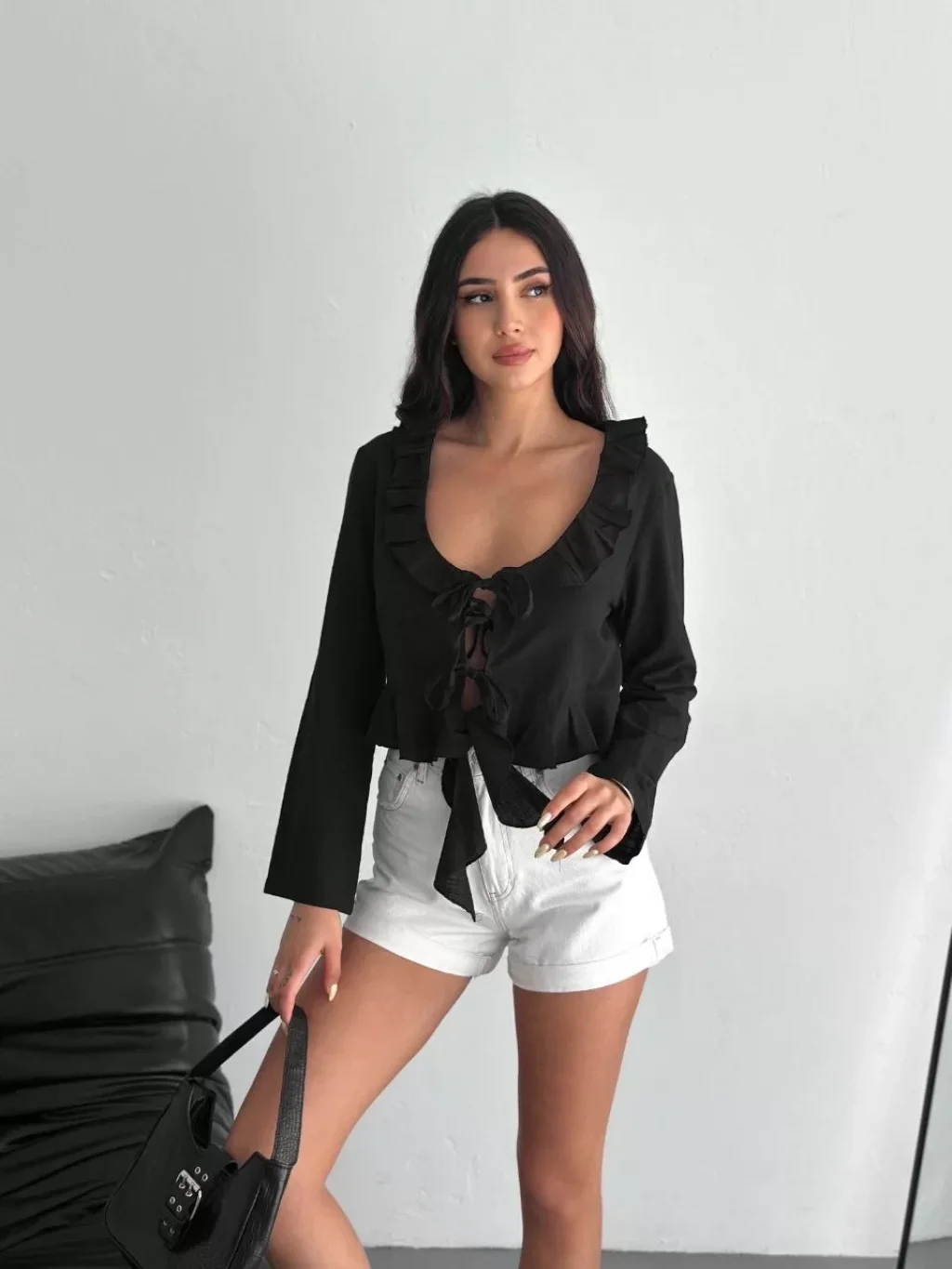 Keten Uzun Kol Bağacık Detaylı Bluz - Siyah