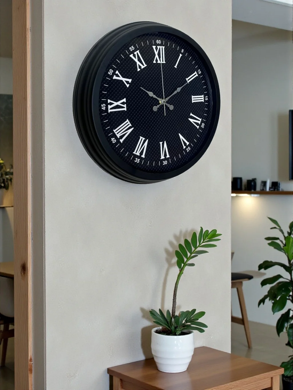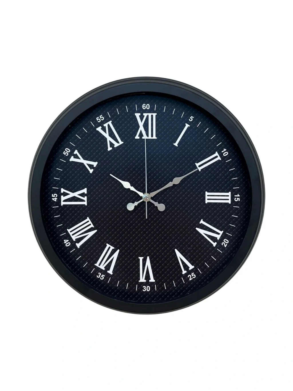 Klasik çizgileri modern detaylarla buluşturan bu Roma rakamlı siyah duvar saati, bulunduğu ortama güçlü ve asil bir karakter kazandırır. Özel dokulu siyah kadranı, saate derinlik ve premium bir görünüm sunarken, beyaz Roma rakamları ile kontrast oluşturarak zamanı net ve rahat okunur hale getirir.