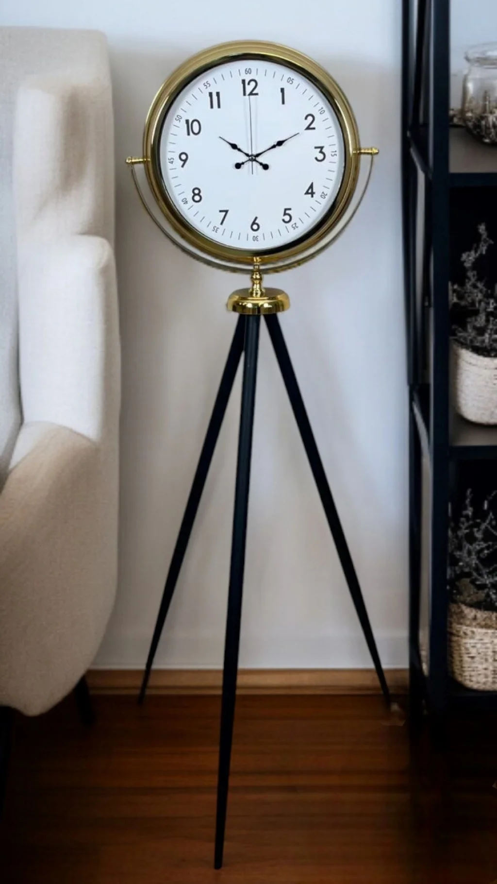 Zarif detayları ve güçlü duruşuyla öne çıkan gold tripod ayaklı dekoratif saat, bulunduğu mekâna sofistike ve prestijli bir hava katar. Klasik saat formu ile modern tripod ayak tasarımının birleşimi, bu modeli sıradan ayaklı saatlerden ayırarak dekorasyonun odak noktası haline getirir.