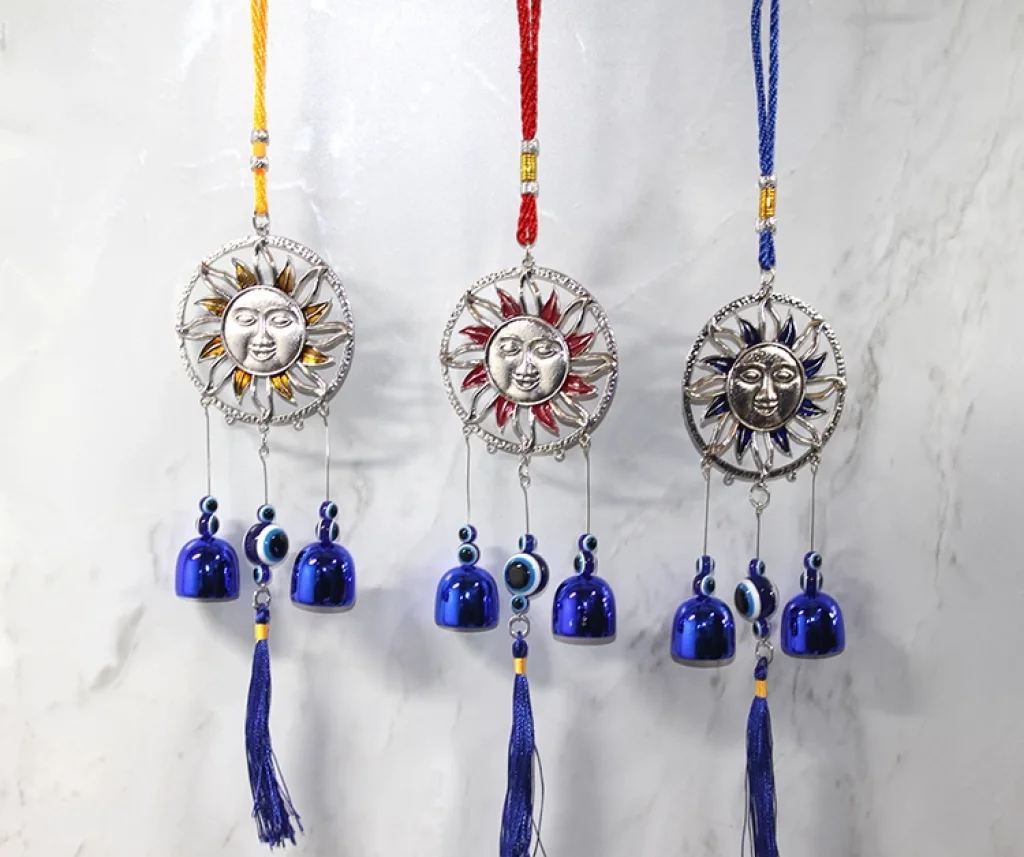 METAL NAZAR BONCUĞU ÇAN MODEL 13Ürün ÖzellikleriMetal Nazar Boncuğu Çan Model 13, güneş figürü ve nazar boncuğu detaylarıyla mistik ve estetik bir dekorasyon ürünüdür. Metal çanları sayesinde hafif bir esintiyle bile hoş bir tını yayarak ortamınıza huzur katar. Nazar boncuğu kötü enerjilere karşı koruma sağladığına inanılan geleneksel bir sembol olarak tasarıma dahil edilmiştir. Kapı, pencere, balkon veya bahçe gibi alanlarda kullanıma uygundur. Şık ve otantik tasarımıyla iç ve dış mekanlarda dekoratif bir hava yaratır.Paket İçeriği1 Adet Metal Nazar Boncuğu Çan