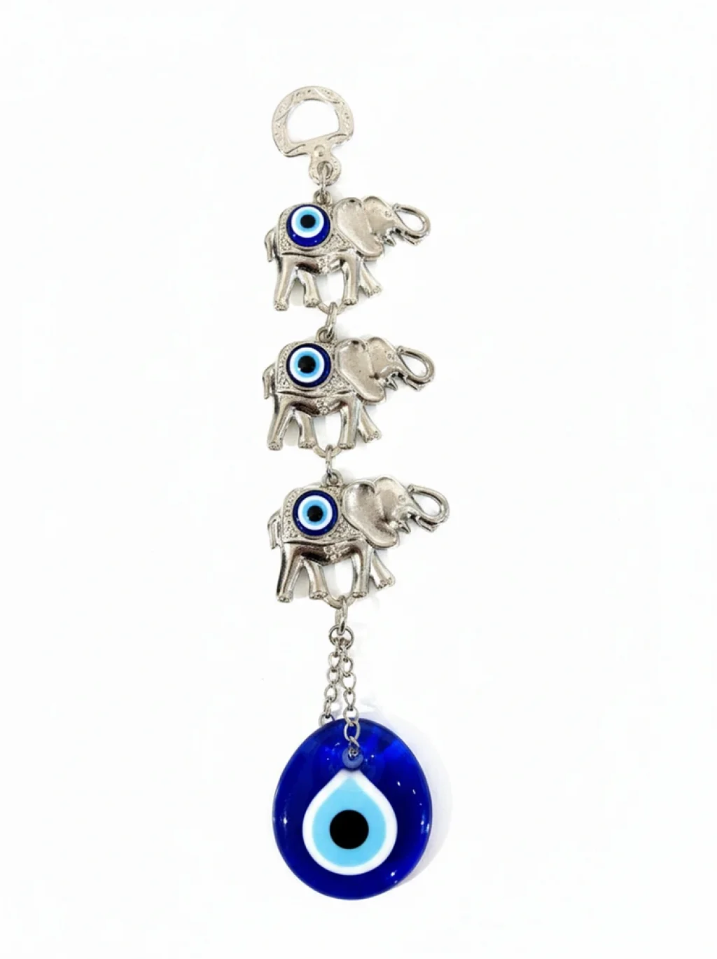 NAZAR BONCUĞU 3’LÜ FİL ASKILIKÜrün ÖzellikleriNazar Boncuğu 3’lü Fil Askılık, üç adet fil figürü ve büyük nazar boncuğunun bir araya geldiği dekoratif bir tasarımdır. Fil figürü kültürel olarak şans, güç, dayanıklılık ve bereketi temsil ederken, nazar boncuğu ise kötü enerjilere karşı koruyucu bir sembol olarak bilinir. Bu iki anlamlı motifin birleşimi yaşam alanlarına hem estetik hem de sembolik değer kazandırır. Metal malzemesi sayesinde dayanıklı ve uzun süre kullanıma uygundur. Kapı girişine, duvarlara, araç içine veya ofis masasına asarak dekoratif bir görünüm elde edebilirsiniz. Üçlü fil tasarımı, bolluğun artması ve bereketin çoğalması anlamını taşır; bu nedenle ev hediyesi, işyeri açılışı veya özel günler için zarif ve anlamlı bir hediye seçeneğidir. Geleneksel mavi nazar boncuğu detayları bulunduğu ortama renk katar ve dikkat çekici bir görünüm sağlar.Paket İçeriği1 Adet Nazar Boncuğu 3’lü Fil Askılık