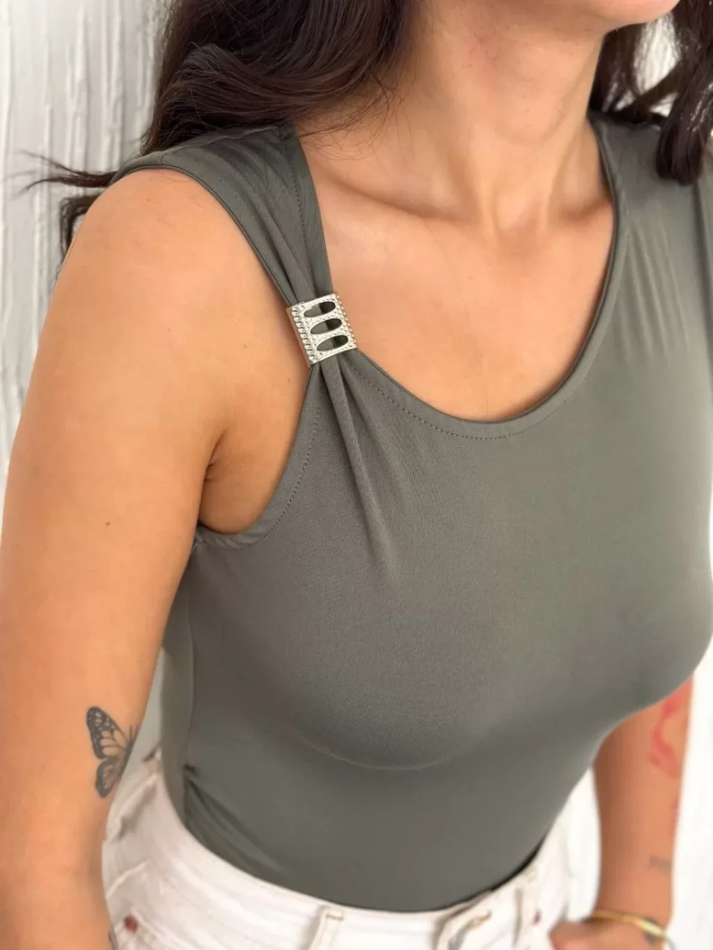 Osy Modal Yumuşak Dokulu Kumaş Bisiklet Yaka Kadın Sıfır Kol Bluz Omuz Toka Aksesuar Detaylı - Haki
