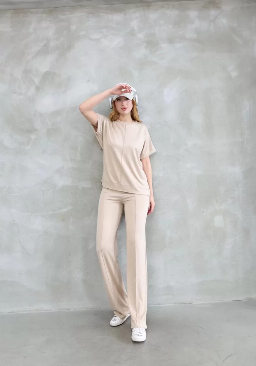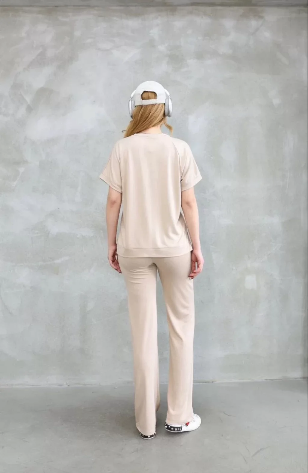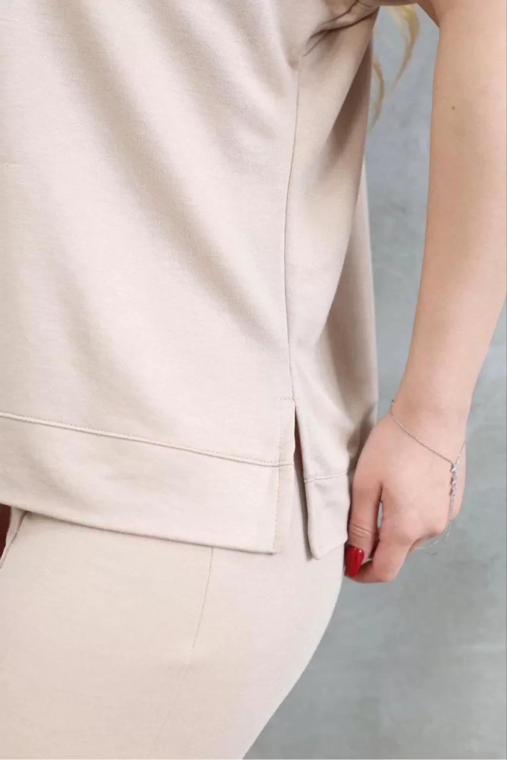 Osy Modal Yumuşak dokulu Kumaş Bisiklet Yaka Kısa Kollu Takım - Bej