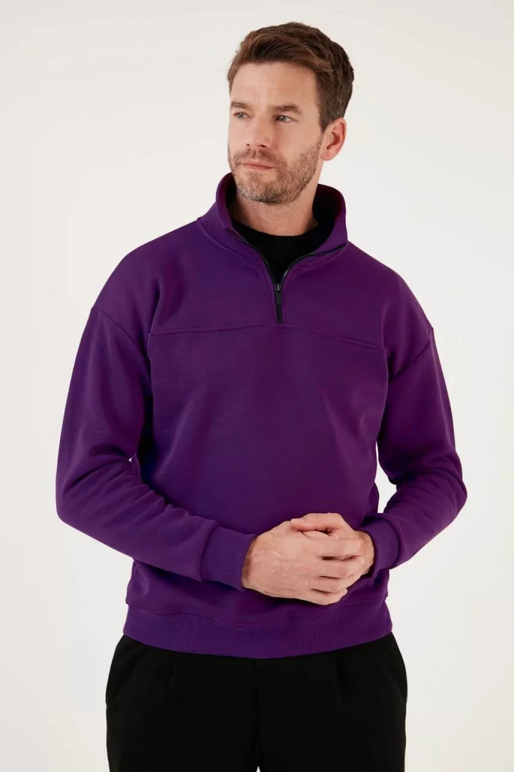 Oversize Yarım Farmuarlı Yakalı Basic SweatShirt - Mor