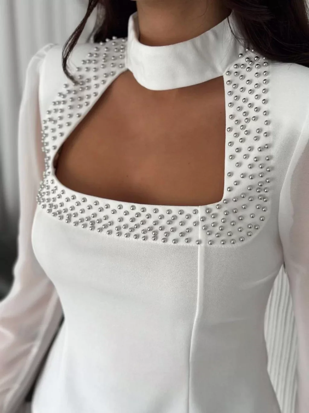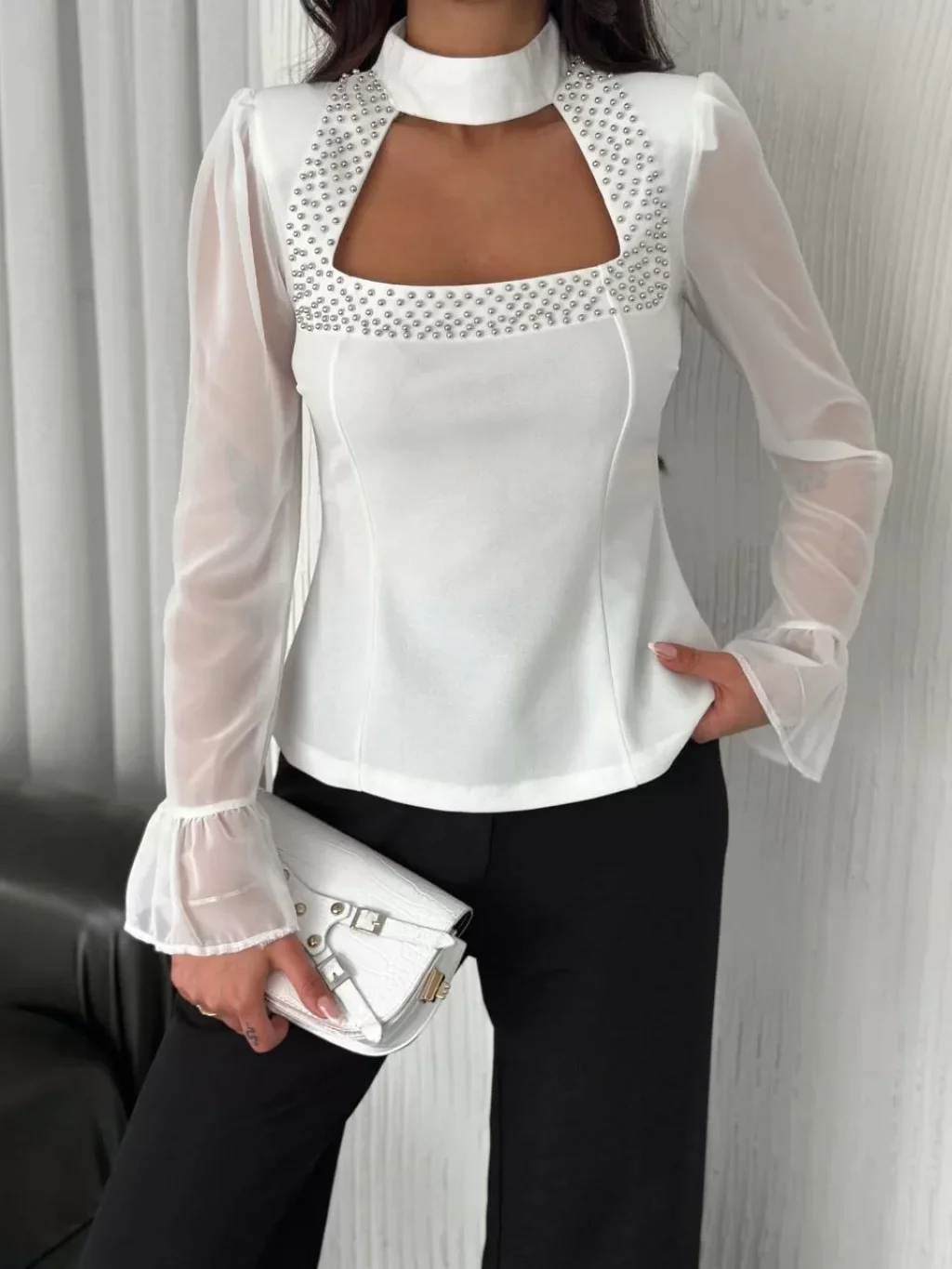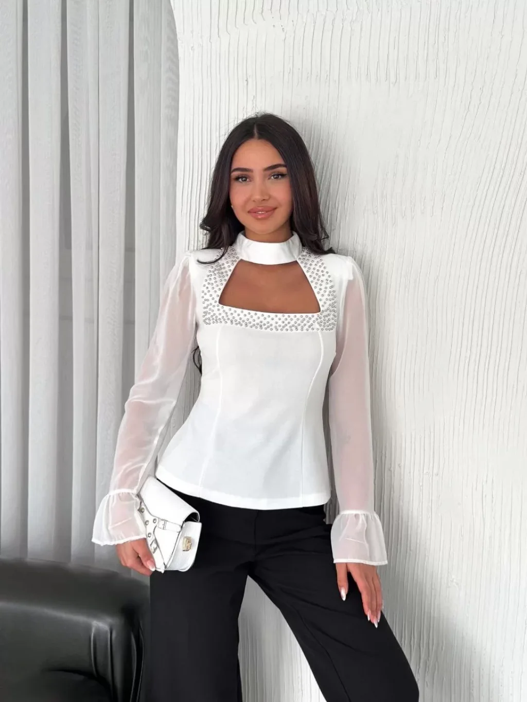 Penye Uzun Kollu Kadın Kolları Şifon Göğüste İnci Boncuk detaylı Bluz - Beyaz