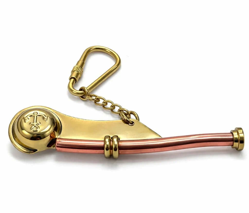 PİRİNÇ SİLİSTRE DÜDÜĞÜ ANAHTARLIK Ürün ÖzellikleriDenizcilik tarihinin en ikonik simgelerinden biri olan Silistre düdüğü, şimdi prestijli bir anahtarlık tasarımıyla cebinizde! Yüksek kaliteli pirinç ve bakır detaylarla üretilen bu özel anahtarlık, aslına sadık kalınarak tasarlanmış formuyla büyüleyici bir nostalji sunar. 12 cm toplam uzunluğa sahip olan bu ürün, sadece dekoratif bir obje değil, aynı zamanda net bir ses çıkarabilen fonksiyonel bir mini enstrümandır. Altın sarısı pirincin parıltısı ve bakırın sıcak tonu, ürüne otantik bir "deniz kurdu" havası katar. Güçlü metal zinciri ve güvenli vidalı klips mekanizması sayesinde anahtarlarınıza, teknenizin anahtar grubuna veya sırt çantanıza kolayca takılabilir. Deniz tutkunları, eski denizciler ve marin temalı aksesuar koleksiyonerleri için paha biçilemez bir hediye seçeneğidir. Her detayında işçilik barındıran bu pirinç silistre anahtarlık, stilinize karakteristik ve tarihsel bir derinlik kazandıracak.Ürün Teknik ÖzellikleriÖzellikAçıklamaMalzemeYüksek Kaliteli Pirinç ve Bakır AksamToplam Boyut12 cmFonksiyonSes Çıkarabilen Aktif Silistre DüdüğüTasarımGeleneksel Denizci Düdüğü (Bosun's Whistle)AparatVidalı Metal Klips ve Dayanıklı ZincirKullanım AlanıEv, Araba, Tekne Anahtarlığı, Çanta AksesuarıStilNostaljik, Marin, Profesyonel Denizci EkipmanıPaket İçeriği1 Adet Pirinç Silistre Düdüğü Anahtarlık