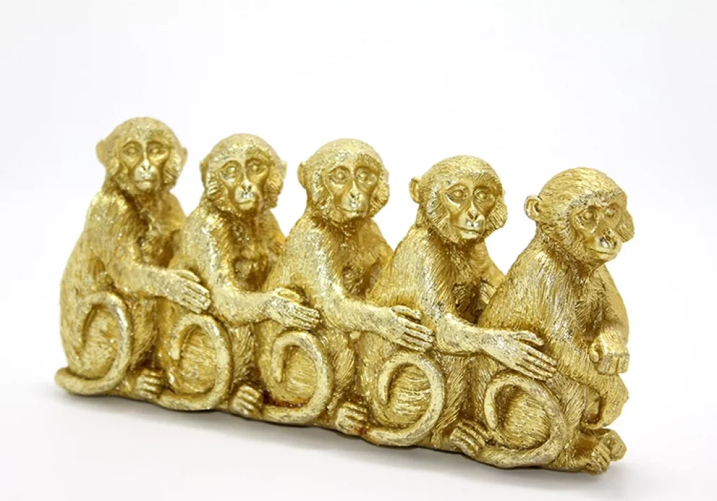 POLYESTER 5 MAYMUNÜrün ÖzellikleriAltın renkli polyester malzemeden üretilen bu şık 5 maymun figürü, 25x11 cm boyutundadır. Figür, altın rengi tasarımıyla dikkat çeker ve dekoratif açıdan evinize zarif bir hava katar. Hem koleksiyonluk hem de hediye olarak mükemmel bir tercihtir.Paket İçeriği1 Adet Polyester 5 Maymun