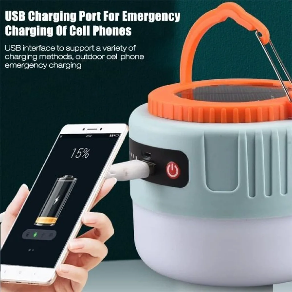 SOLAR LED KAMP LAMBASIÜrün ÖzellikleriEntegre 1200 mAh lityum iyon pil, fenerin güneş enerjisi veya USB üzerinden şarj edilmesini sağlar.Kamp feneri ayrıca taşınabilir şarj cihazı olarak telefonunuzun veya diğer cihazların USB bağlantısı üzerinden şarj edilebilir.Bu kamp lambasının iki ampulü vardır (projektör ve doğrudan ışık), her ışığın üç ışık modu vardır: yüksek ışık, orta ışık ve flaş. 10 parlaklık kademesi. Kamp feneri ayarlanan moda veya parlaklığa göre 5 – 8 saate kadar yanar.Şarj edilebilir.USB fener son derece pratiktir ve yer tasarrufu sağlar.Küçük boyutu sayesinde kamp ışığı sorunsuz bir şekilde bagajınızda, sırt çantanızda veya hayatta kalma kitinizde saklanabilir.Hafif yağmur veya karda açık hava etkinlikleri için uygundur.IP45 koruma sınıfı, bu fenerin tüm açılardan su sıçramalarına karşı korumalı olduğu anlamına gelir.ABS plastik ve alüminyum alaşımlı sağlam tasarım.Kamp lambası, ister evde, arabada, atölyede, iş yerinde, ofiste, spor yaparken veya seyahatlerde lamba yüksek kaliteli ve sağlam bir özelliğiyle etkileyicidir.Paket İçeriği1 adet solar led kamp lambası
