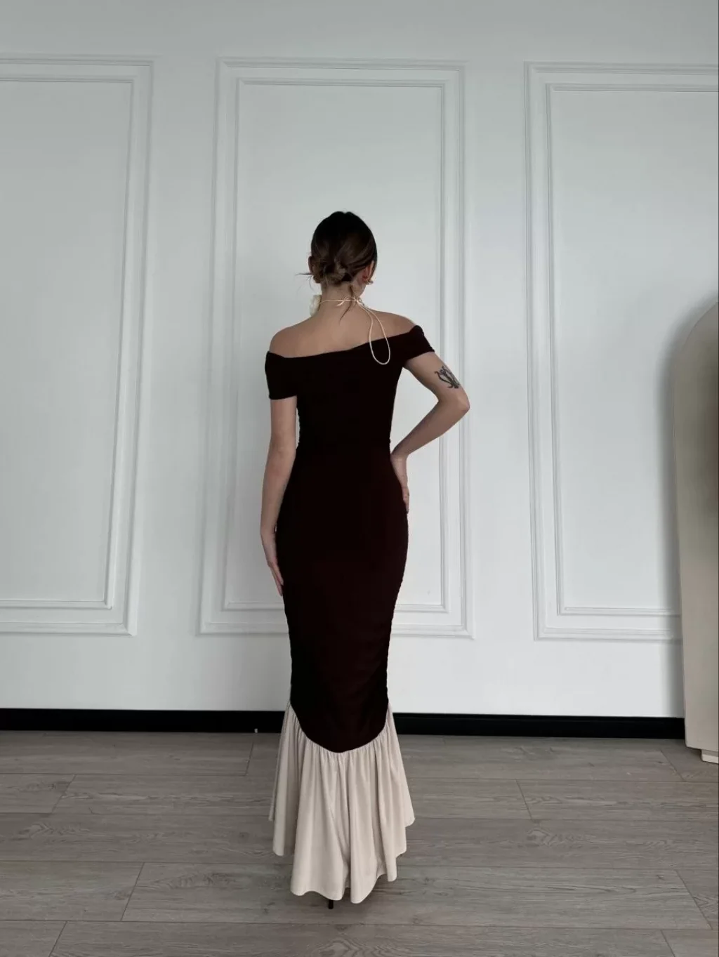 Striptiz Omuzlu Uzun Elbise- Kahve