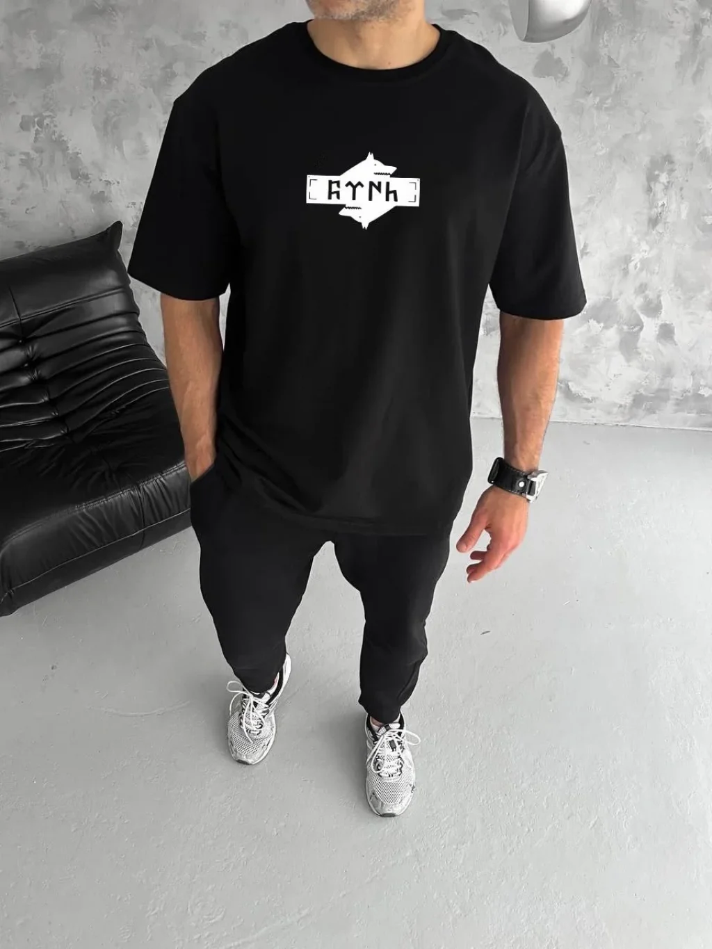 Unisex Bisiklet Yaka Baskılı Double Oversize T-Shirt - Siyah