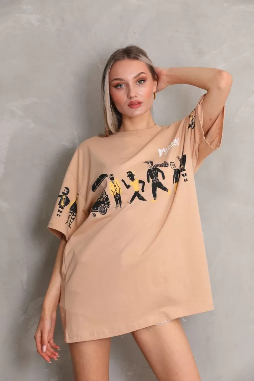 Unisex Bisiklet Yaka Baskılı Oversize T-Shirt - Bej