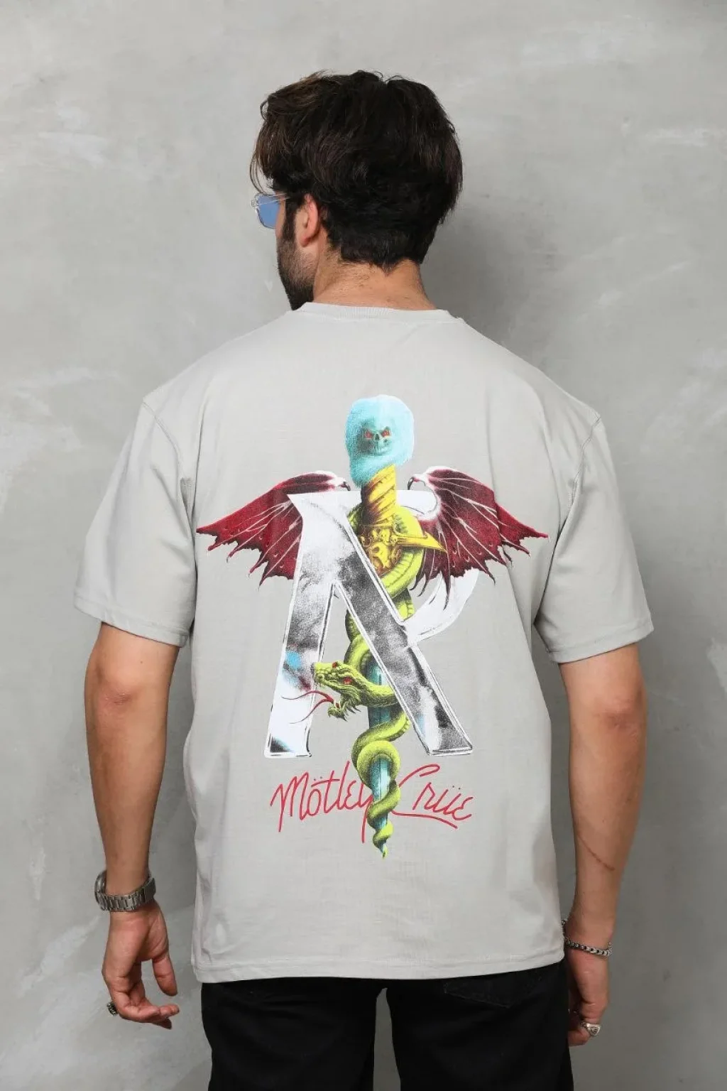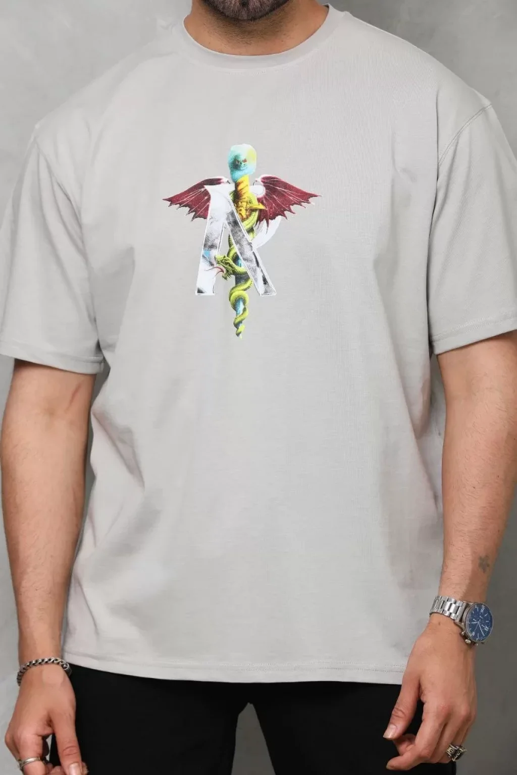 Unisex Bisiklet Yaka Baskılı Oversize T-Shirt - Gri