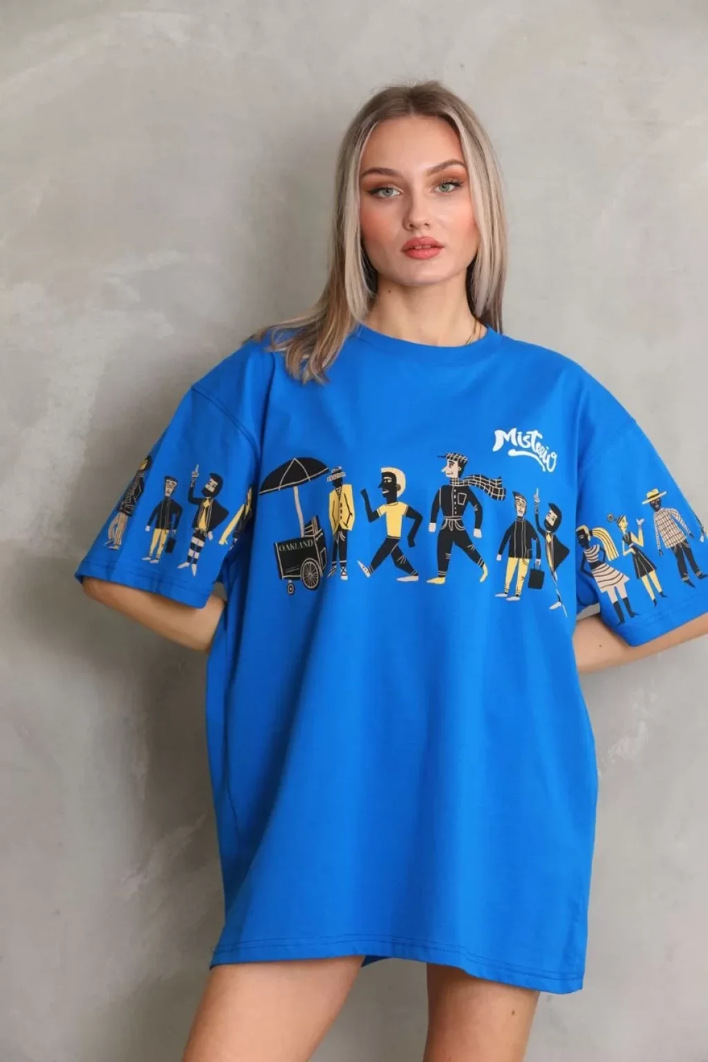 Unisex Bisiklet Yaka Baskılı Oversize T-Shirt - Mavi