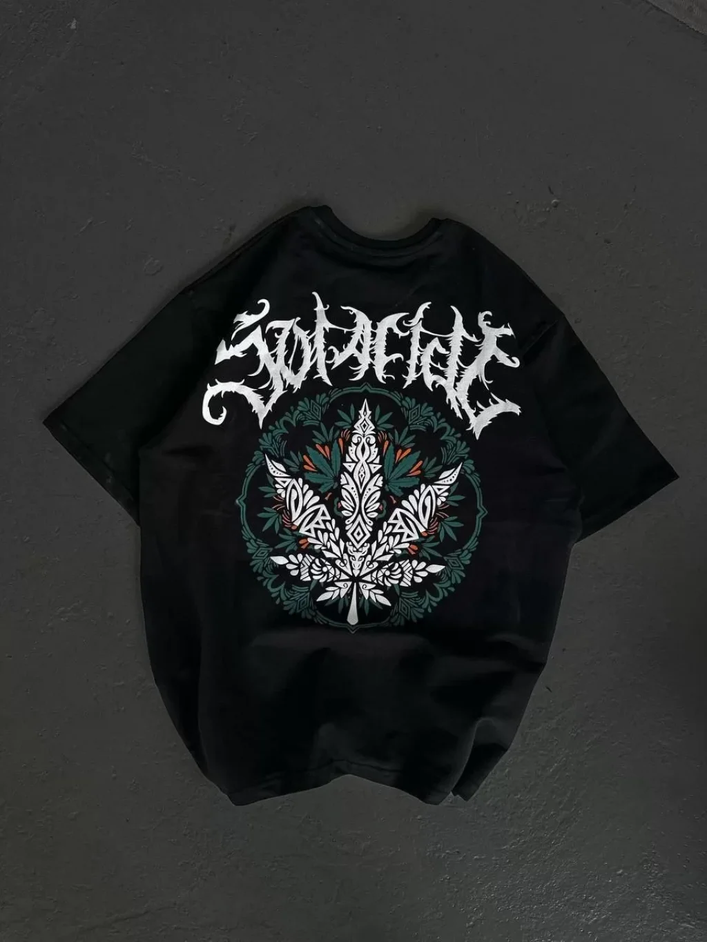 Unisex Bisiklet Yaka Baskılı Oversize T-Shirt - Siyah